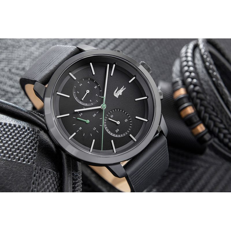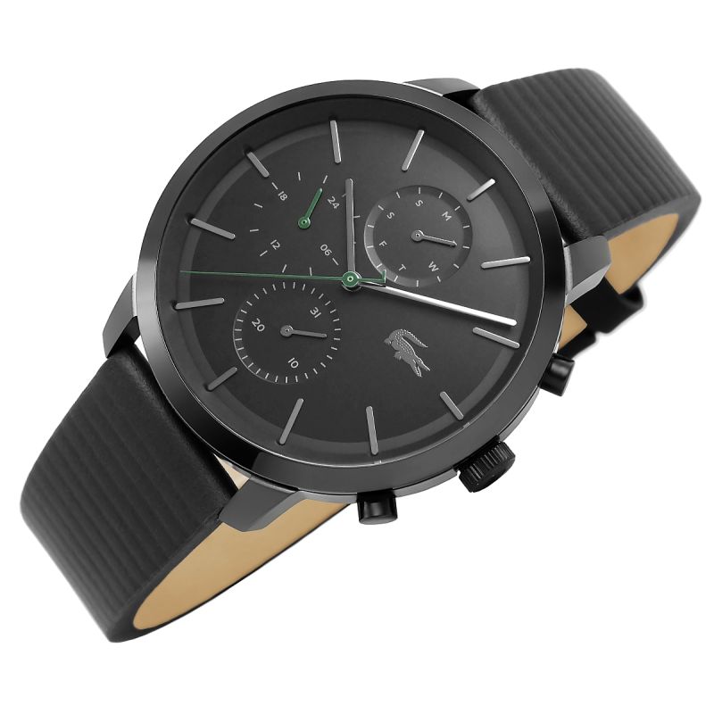 The entire piece is finished in a deep, matte black, giving it a distinctive, powerful look. Subtle green accents on the hands add a touch of dynamism and echo the classic Lacoste logo. Crafted from robust materials, the watch features a stainless steel case for durability and an elegant look. Its textured black genuine leather strap perfectly complements the sporty yet stylish character of this model, ensuring all-day comfort. The black Lacoste logo, proudly displayed on the dial and buckle, is a sign of prestige, evoking timeless quality.