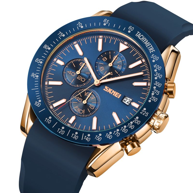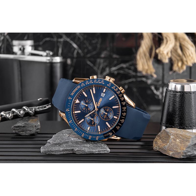 The Skmei 9253 watch with a silicone strap features a color scheme inspired by exclusive premium timepieces, giving it a unique, dynamic character. The copper case contrasts with the deep, bold navy blue metallic bezel and dial, creating a luxurious, sporty look that echoes the style of top global brands. The silicone strap provides additional comfort and lightness, perfectly combining elegance with functionality for any occasion.