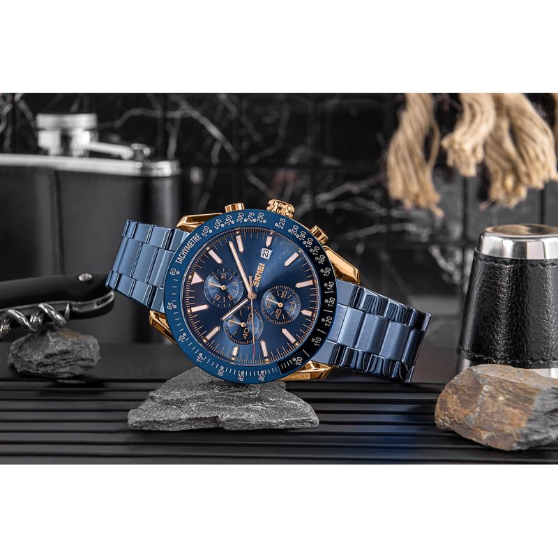 The Skmei 9253 watch features a color scheme inspired by exclusive premium timepieces, giving it a unique character. The copper case and metallic navy blue bracelet evoke luxury and elegance, perfectly complementing the navy blue bezel and dial, a hallmark of top global brand designs. The indices and hands, coated with a luminescent coating, not only emphasize the watch's luxurious style but also ensure excellent visibility in any lighting. The red accent on the seconds hand adds a sporty touch, combining elegance with dynamism.
