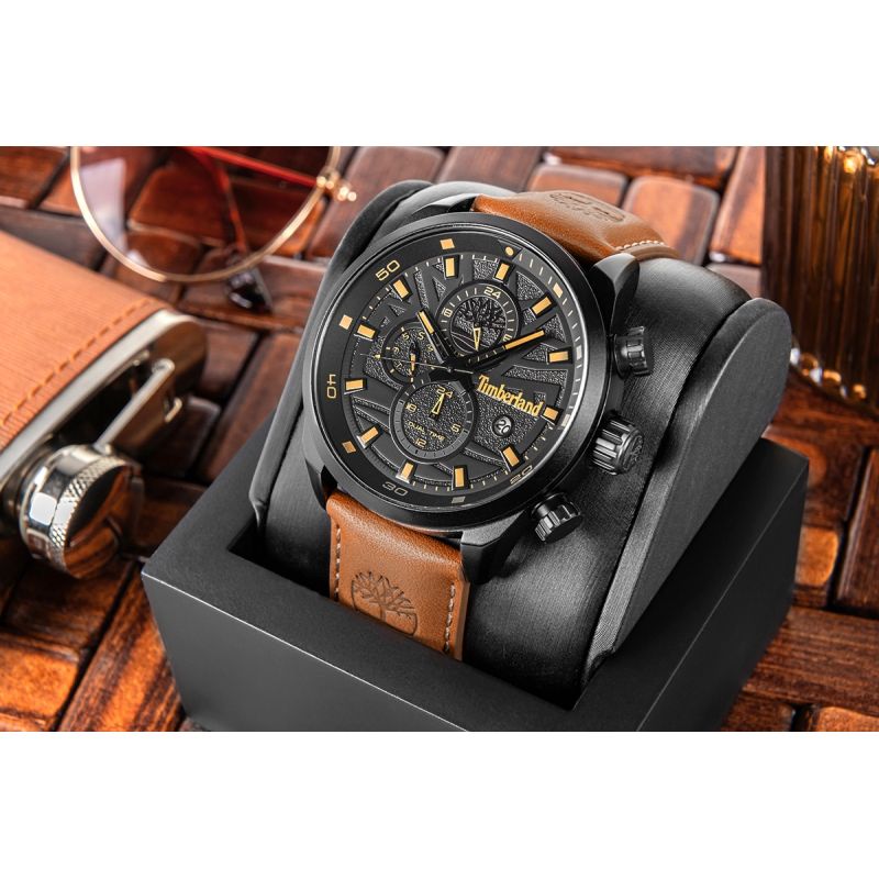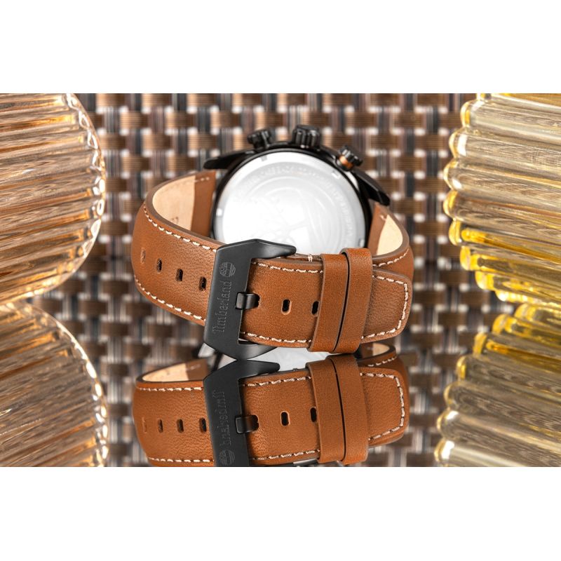 A brown genuine leather strap adds warmth and authenticity to the overall look. Importantly, it's embossed with the Timberland logo on both the outside and inside, highlighting the brand's attention to detail and nature-inspired character.