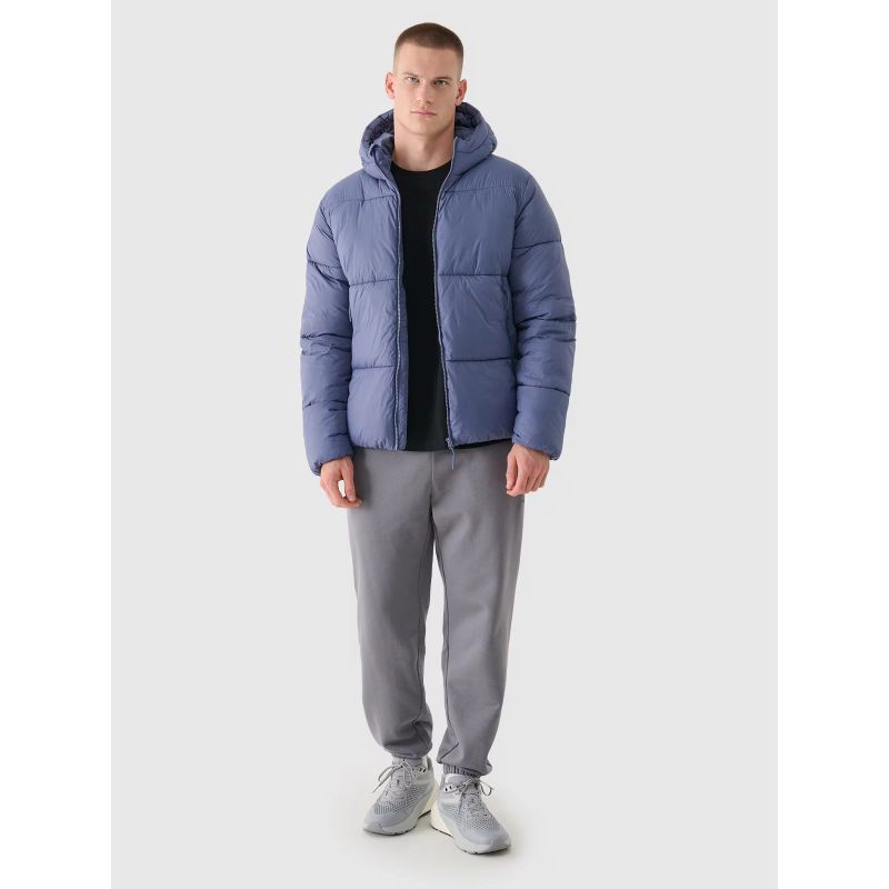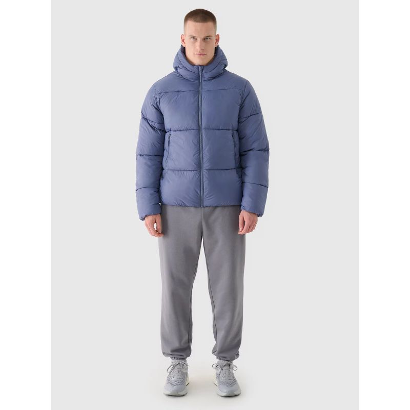 This men's hooded down jacket features a built-in, non-adjustable hood. A high collar covers the neck, providing additional protection against cold and wind. Two zippered pockets are located on the sides. Furthermore, an internal open pocket and a zippered pocket allow for the safe transport of valuables, such as a phone. This men's down jacket fastens with a one-way main zipper with an internal wind flap to prevent cold from entering the jacket. The hem is elasticated.