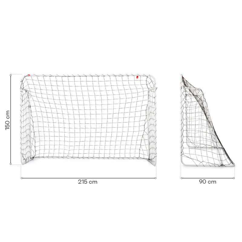 - Made of 0.1 cm thick, 3-thread polyester, the net is resistant to damage and weather conditions. The mesh size (10x10 cm) ensures that any ball can be stopped. The goal, with its universal dimensions of 215x150x90 cm, is suitable for use in the garden, on the plot, at the beach, or on the school playground.