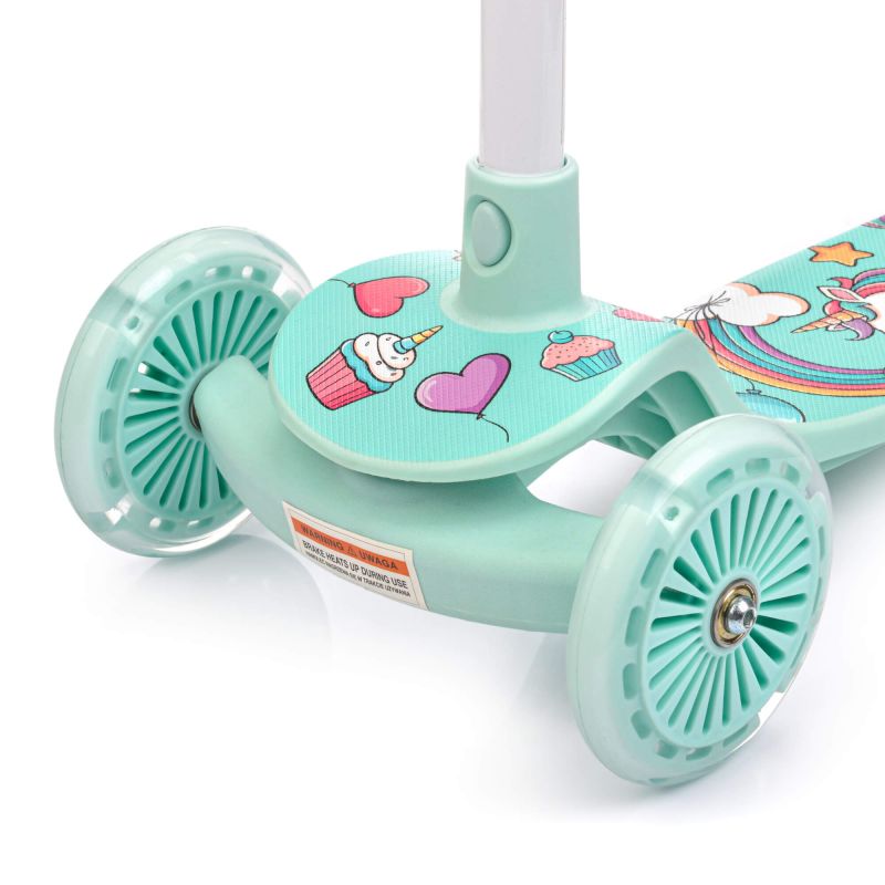 Hard PUC wheels equipped with ABEC-7 bearings ensure a quiet ride, good grip, and durability. Built-in LED lights improve visibility and safety. The light-up wheels are also an attractive addition that every child will notice. At the rear of the scooter, there's a foot brake, operated by pressing the brake against the wheel with your foot, significantly maximizing riding safety. The brake also functions as a fender, protecting against splashes.
