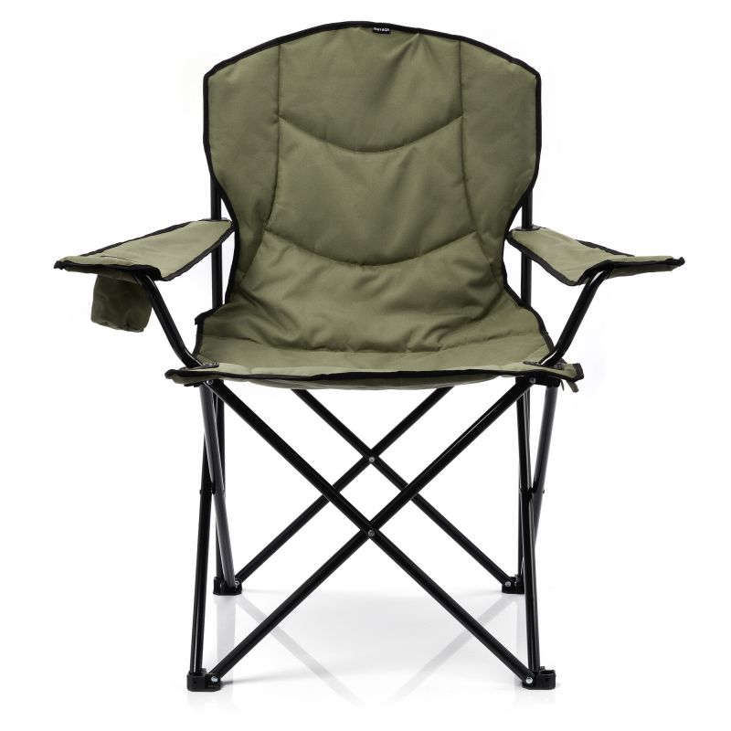 - The seat and backrest of the Hiker chair are made of durable 600D Oxford polyester, which is highly resistant to abrasion, stretching, and weathering. Comfort has not been overlooked – the wide backrest and armrests guarantee comfort even during extended use. An additional advantage is the practical pocket, which can easily hold small items like a phone or keys, so you can always have them close at hand. Specially designed legs add stability, ensuring firm footing on various terrain.