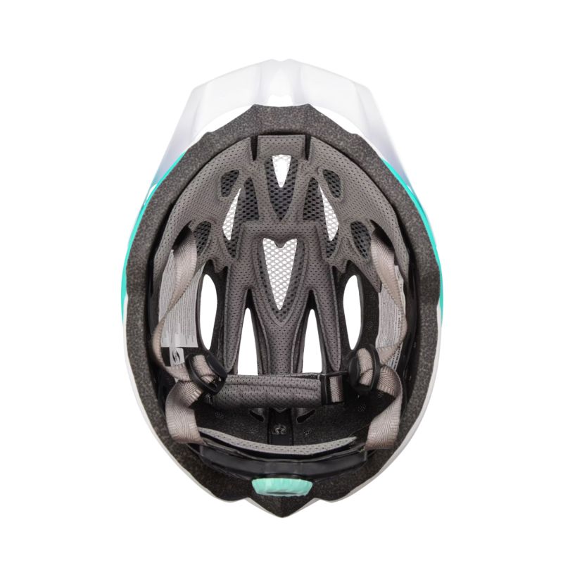 Meteor Ovlo M Bike Helmet 55-58 cm White and Mint 17862. The Meteor helmet provides maximum head protection while cycling, scootering, inline skating, roller skating, quad biking, or skateboarding. It features reflective details and a lightweight, ergonomic design. The shell, made of highly flexible EPS polystyrene, protects against injuries by absorbing all the stresses that can occur during a fall. The visor is permanently attached. The helmet is size-adjustable using a multi-position ring (Fit Size-headlock closure) and special buckles. The padding is removable for washing and drying. 23 ventilation openings with the Air Flow system ensure a constant airflow. The helmet features countless microscopic air pores. Technical data: · Outer shell material: PVC · Absorbent material inside: EPS · Certificate - product complies with the requirements of the European standard EN 1078 · Size M: adjustment 55-58 cm · Fit Size System - headlock multi-stage ring for smooth circumference adjustment; using one hand, you can easily adjust the helmet to your head using a small knob located at the back of the helmet · Antibacterial interior - soft, pleasant to the touch lining that does not catch on hair, prevents the growth of bacteria and reduces unpleasant odors caused by sweat · Air Flow System - constant air circulation around the head and heat dissipation · Fly Net System - mesh located in the front ventilation openings, protects the head from insect bites when riding in warm and humid conditions · Quick-Release System - quick fastening buckles · Removable lining elements - it is easier to keep the sweat-absorbing elements clean when they can be washed and dried efficiently