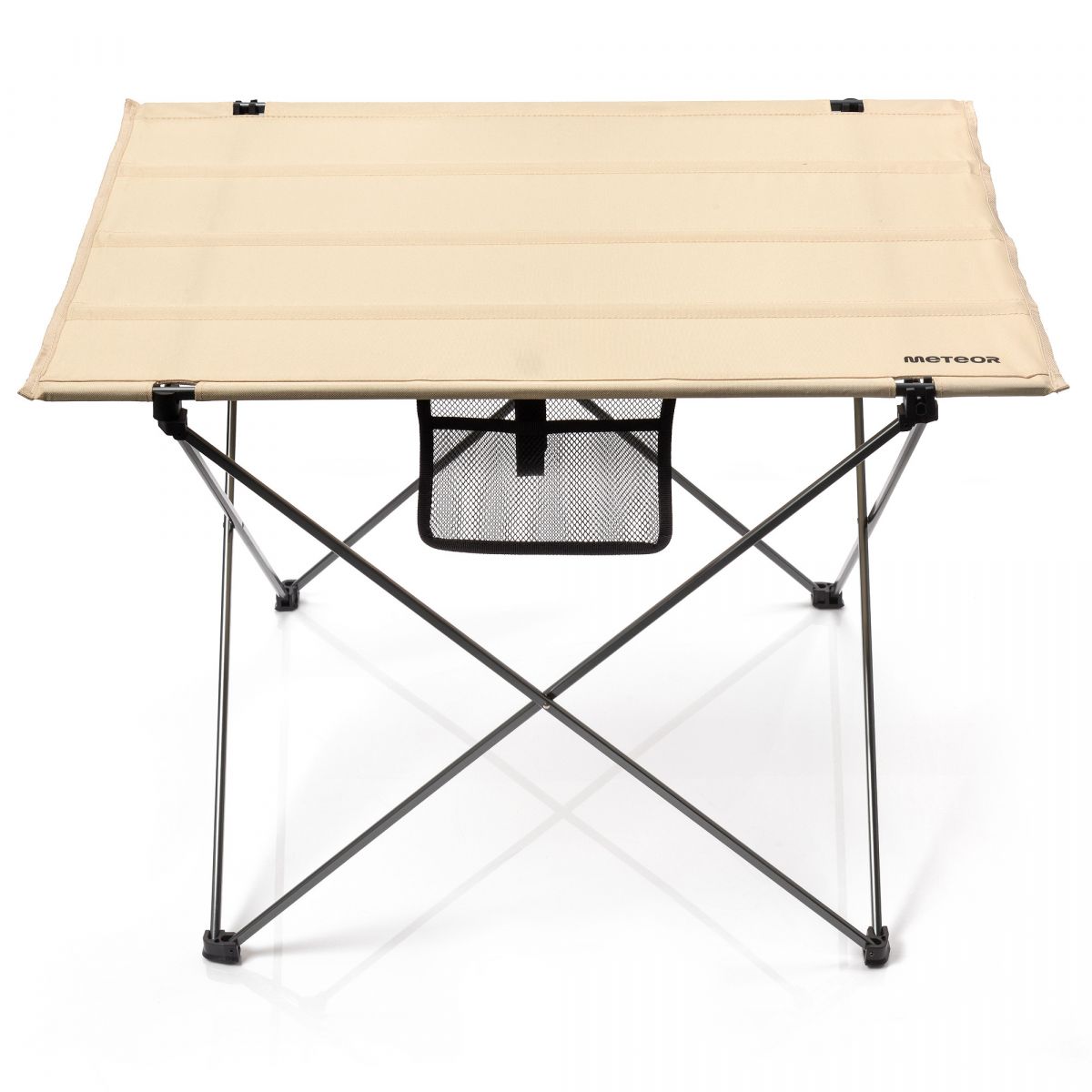 - The Meteor Viator camping table is a compact and incredibly practical solution for lovers of active recreation in the great outdoors. Constructed from lightweight yet durable aluminum, it offers stability and durability. Thanks to the 600D polyester Oxford fabric covering the tabletop, it's highly splash-resistant and easy to clean – if it gets dirty, simply wipe it with a damp cloth.