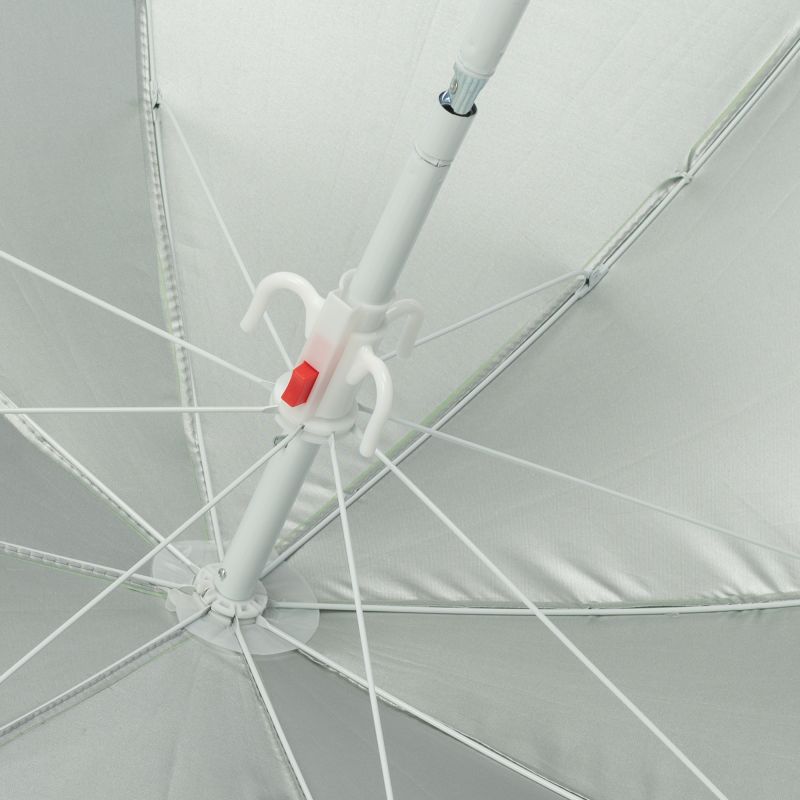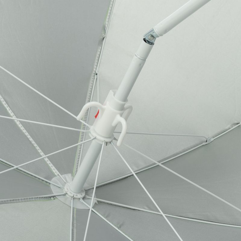 BEACH UMBRELLA SIZE: Ø 160 cm MATERIAL COMPOSITION: OXFORD FABRIC WITH SILVER COATING SPECIFICATIONS: - UV PROTECTION – UPF 50 - THREE-PRONGED HOOK