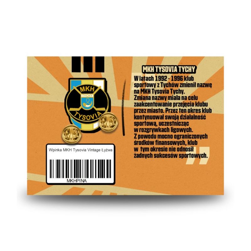The MKH Tysovia Vintage Ice Skate Pin is a unique accessory for hockey fans and the Tysovia club, inspired by the classic style of hockey footwear. Key features: Unique design: Stylized ice skate with the MKH Tysovia crest and details in club colors. High-quality material: Metal crafted with a precise gold-tone finish. Clasp: Solid and reliable, allowing easy attachment to clothing, backpacks, or bags. Dimensions: 28 mm x 35 mm Collectible nature: The perfect accessory for fans and collectors of sports memorabilia. The MKH Tysovia Vintage Ice Skate Pin is a perfect way to show your support for the team and your passion for hockey!