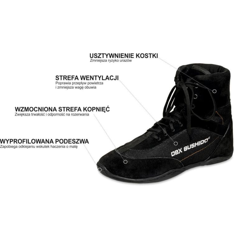 The design and materials used were selected to ensure optimal training conditions in terms of comfort and minimize the likelihood of injury. The high, stiffened ankle profile reduces the risk of ankle sprains, while the contoured rubber sole ensures adequate grip.