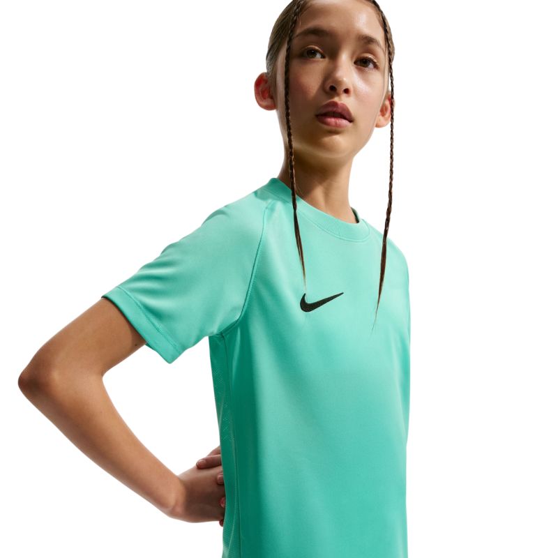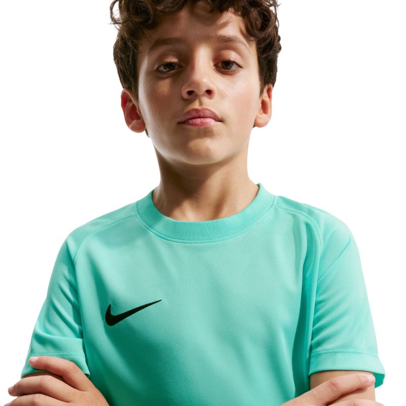 Nike Dri-FIT Park VIII Kids' Tee, Turquoise HV8182 354. This junior Nike tee offers reliable comfort during active play. It features a standard fit with short sleeves and a crew neck for comfort and natural range of motion. Dri-FIT technology wicks sweat away from the skin. Mesh back. Material: 100% recycled polyester