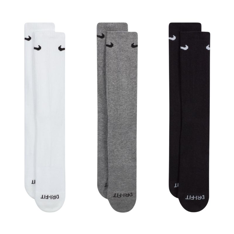 Nike Everyday Plus Cushioned Socks 3 Pairs White, Gray, Black SX6888 964. These 1/3-calf Nike socks help you stay comfortable during physical activity. Their ergonomic design and durable, flexible materials ensure breathability and moisture management. Dri-FIT technology ensures breathability and moisture management. A special band fits snugly around the arch of your foot for support. Cushioning in the forefoot and heel area. Ribbed uppers prevent the socks from riding up. The upper panels are made of finer yarns for improved ventilation. Reinforced heel and toe areas increase durability. Set includes 3 pairs. Material: 62-69% cotton, 29-36% polyester, 2% spandex