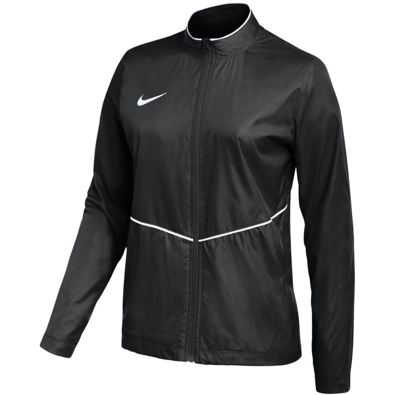 Nike Park 26 Rain Jacket for Women, Black (HM7267 010). This Nike women's rain jacket is perfect for training. Water-resistant material provides protection from light rain. Standard fit. Full-length zipper. Stand-up collar. Zippered side pockets. Piping. Small logo. Material: 100% recycled polyester