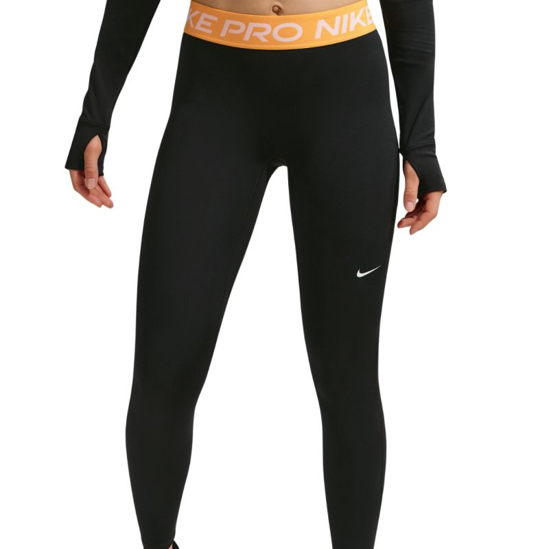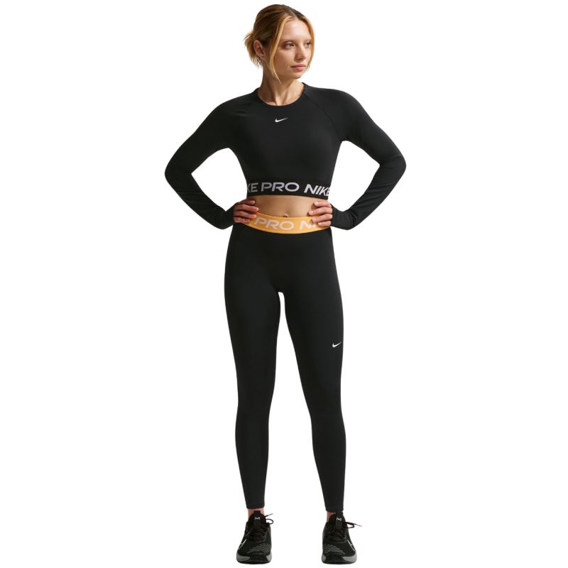 Nike Pro Women's Leggings Black IQ0886 014 Nike women's training tights. They feature Dri-FIT technology that wicks moisture away and keeps you dry. A mid-rise elastic waistband. The seamless front seam prevents material from shifting and provides a uniform, smooth surface during movement. Specifications: Material: 78-83% polyester, 17-22% elastane Jacquard elastic waistband with "Nike Pro" logo Material composition may vary. See label for exact information.