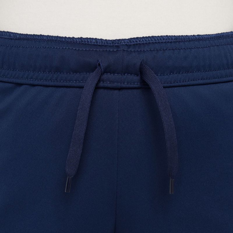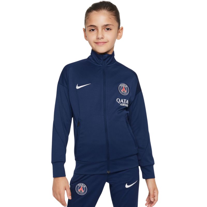 Nike PSG Dri-Fit Academy Pro Navy Blue FQ0063 411 Kids' Tracksuit. This tracksuit is a functional addition to any young fan's athletic wardrobe. It features the Paris Saint-Germain logo. Dri-FIT technology wicks away moisture. The sweatshirt features a full-length zipper and zippered pockets. The tracksuit bottoms feature elastic cuffs. The elastic waistband is adjustable with a drawstring. Material: 100% polyester