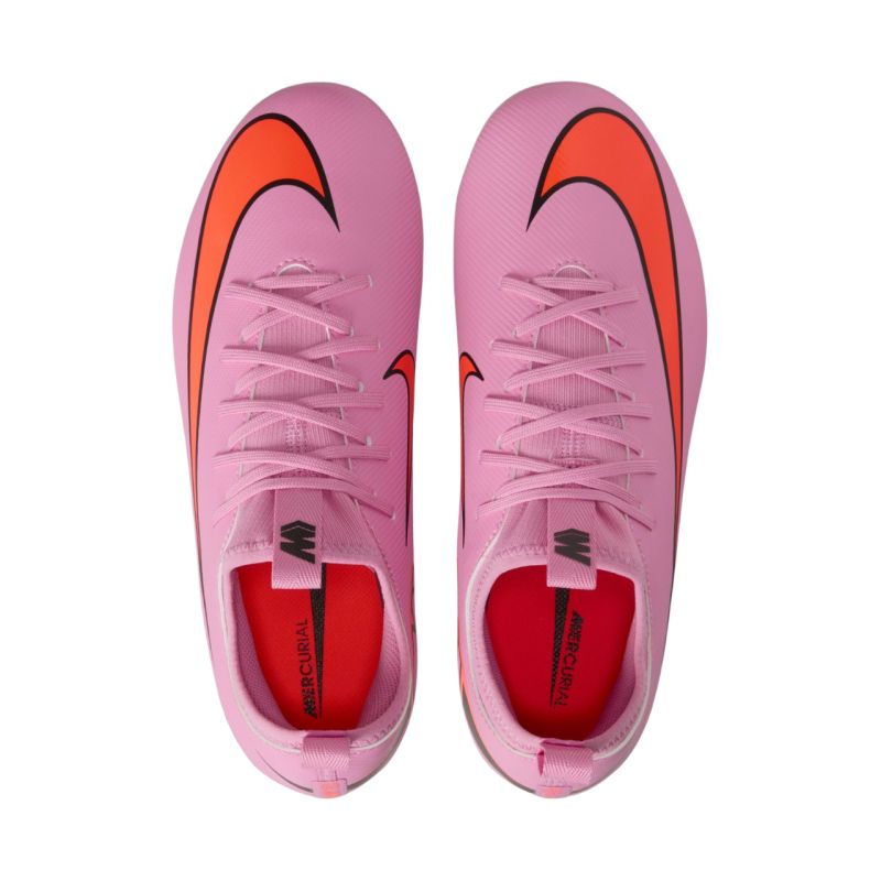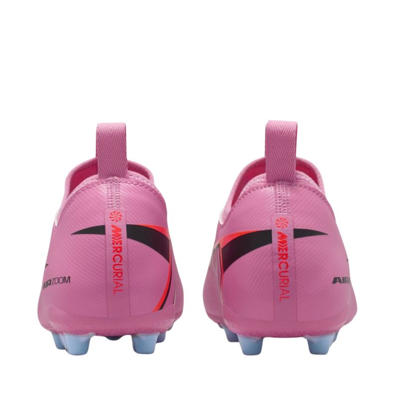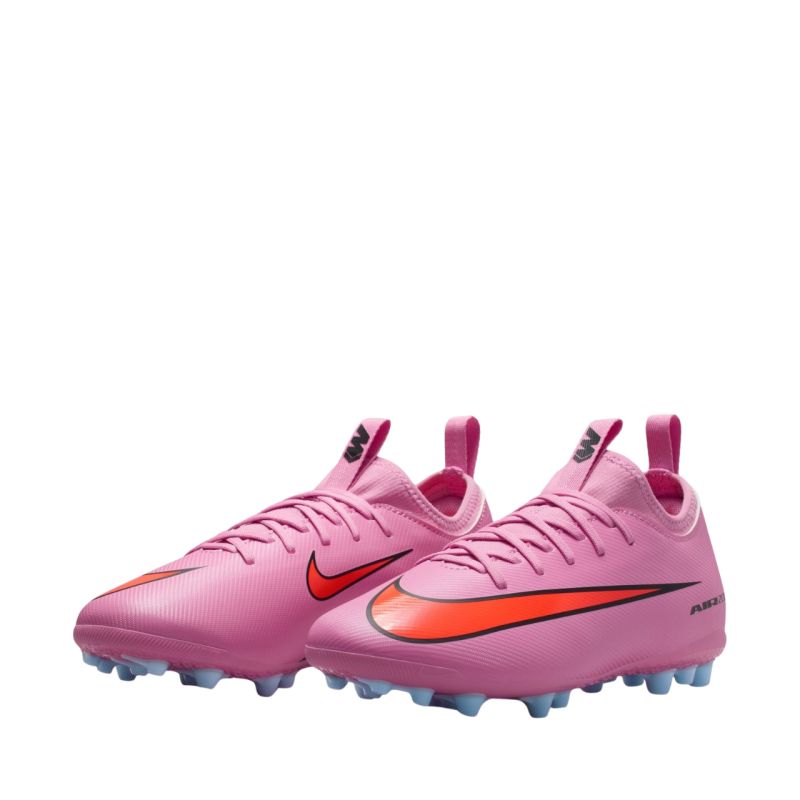 Nike Zoom Mercurial Vapor 16 Academy AG FQ8403 600 Kids' Football Boots. These Nike kids' football boots are designed for training on long, artificial grass surfaces. They're part of the Scary Good collection. The upper is made of NikeSkin material and covered with a chevron pattern. They feature a classic lacing construction. They feature a knit collar and tongue. They feature a cushioned sockliner. Well-placed studs are also included. The Zoom Air unit is located in the rearfoot of the outsole.