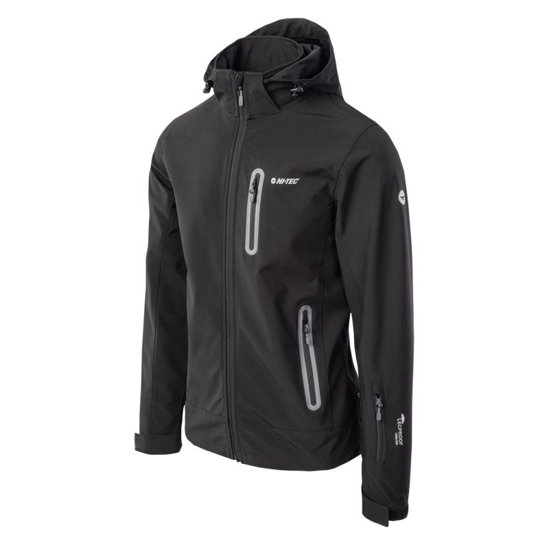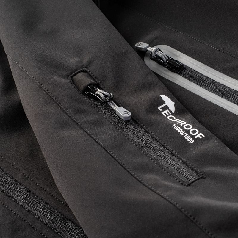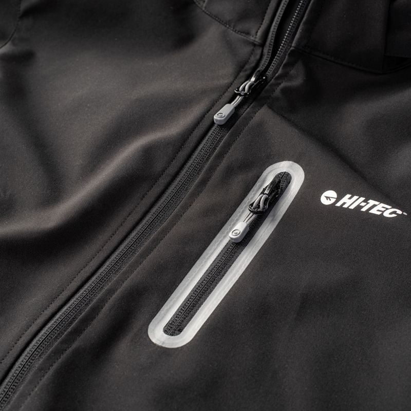 SOFTSHELL JACKET MATERIAL COMPOSITION: 94% POLYESTER, 6% ELASTANE SPECIFICATIONS: - WATER RESISTANCE 10,000 mm H₂O - BREATHABILITY 1,000 g H₂O /m² - WINDPROOF - DWR COATING - MATERIAL STRETCHES IN LENGTH AND WIDTH - DETACHABLE HOOD - ADJUSTABLE HOOD - REFLECTIVE ELEMENTS