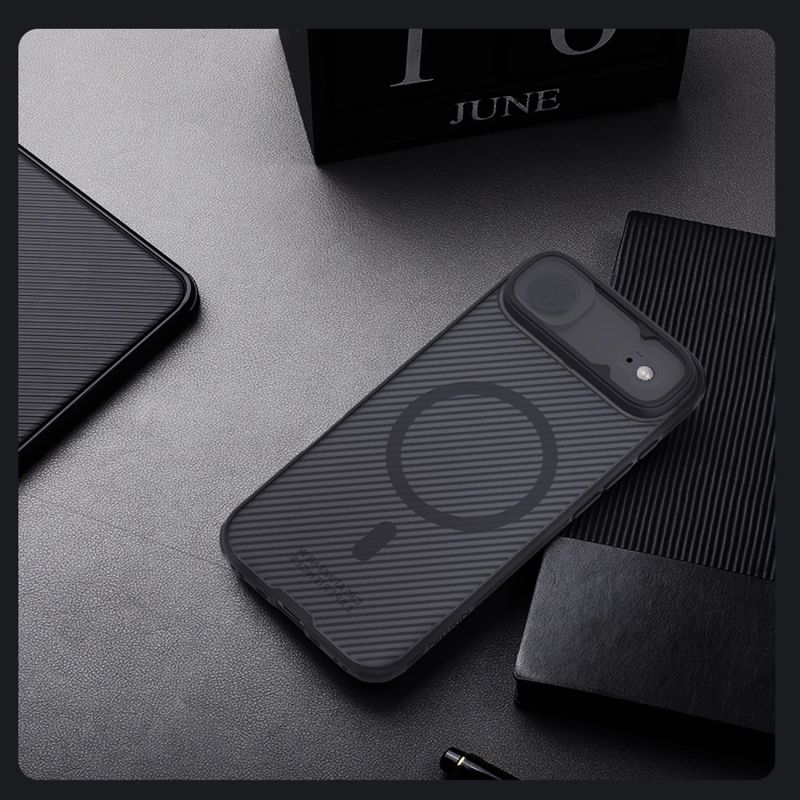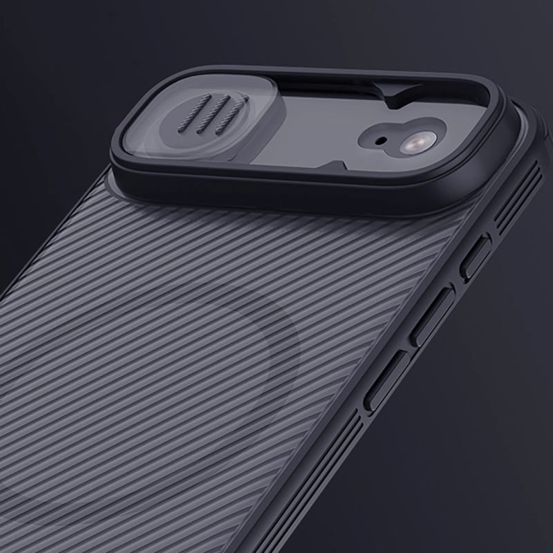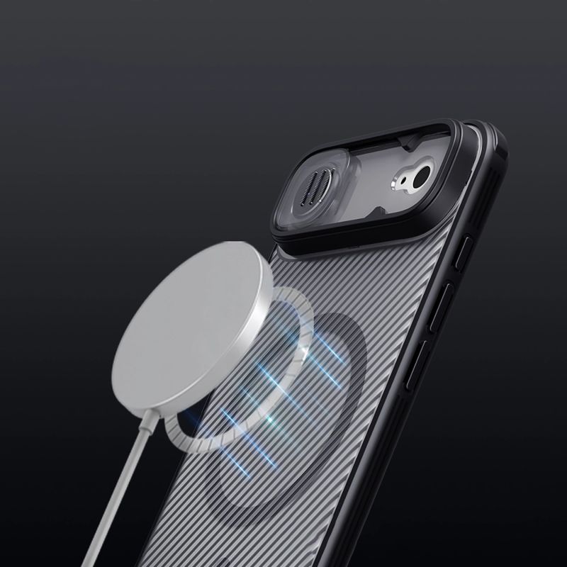 The Nillkin CamShield Pro case is a protective magnetic case designed for the iPhone 17 Air. A built-in magnetic ring allows for convenient wireless charging and MagSafe-compatible accessories without removing the case. The dual-material construction—rigid PC and flexible TPU—enhances the phone's resistance to drops and impacts. The transparent black finish preserves the device's visible design while giving it a modern, technical feel.