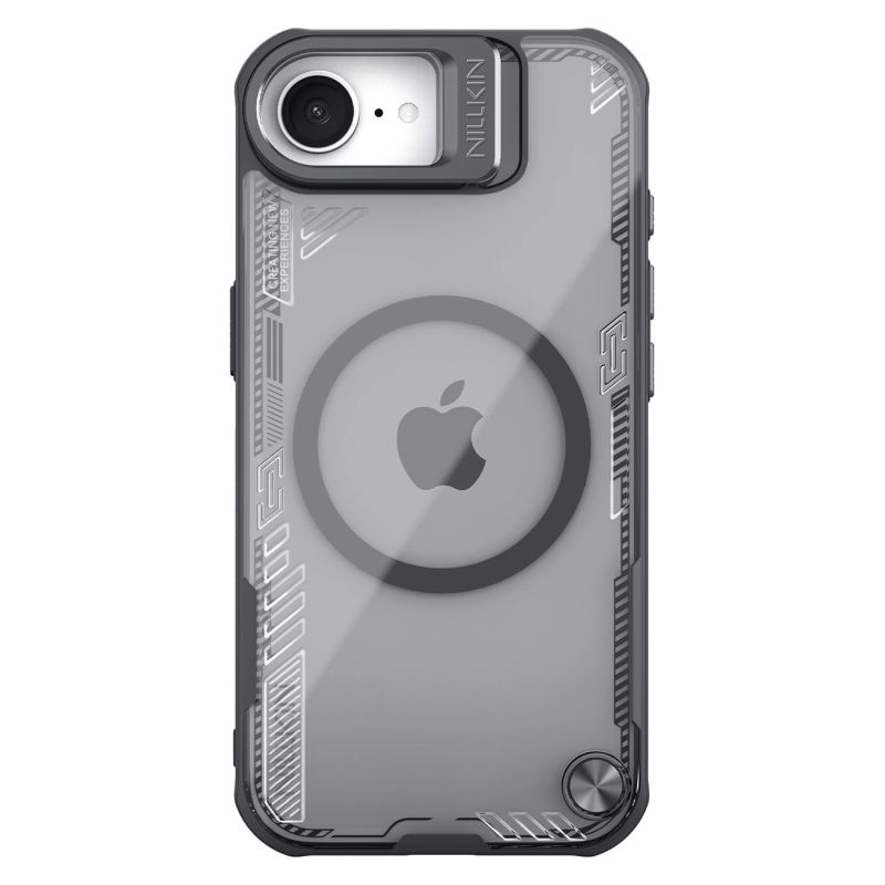 The Nillkin Iceblade Prop Magnetic Case offers durable and stylish protection designed specifically for the iPhone 16e/17e. It features bio-based polymers derived from corn and sugarcane, making it environmentally friendly, exceptionally durable, and resistant to yellowing. Instead of a traditional camera cap, an aluminum protective frame protects the lenses without obscuring them, while also acting as a functional stand. Thanks to its strong magnet, the case works perfectly with MagSafe accessories—from chargers to wallets and holders. Reinforced corners and flexible TPU material provide excellent impact absorption, minimizing the risk of phone damage. The matte black finish gives it a sleek look and effectively protects against fingerprints and dirt.