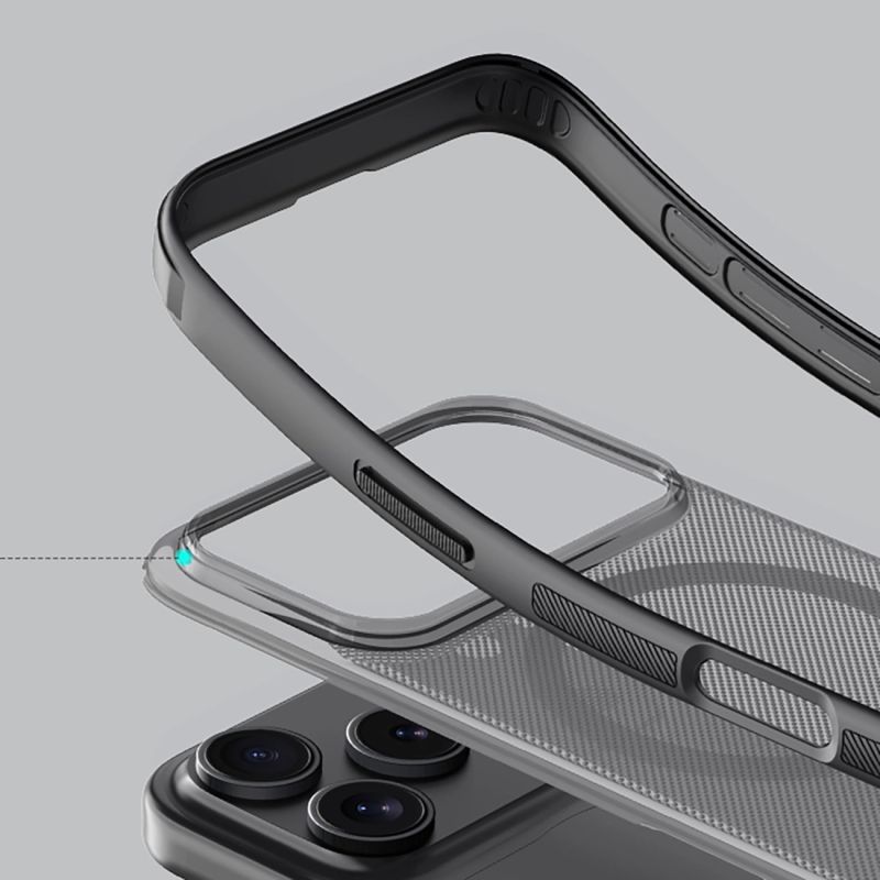 The Nillkin Super Frosted Shield Pro case is a durable cover designed for the iPhone 17 Pro. A built-in, MagSafe-compatible magnetic module allows for convenient use with magnetic chargers and mounts. The dual-material construction effectively protects the smartphone from drops and scratches. The non-slip surface improves grip, and raised edges protect the screen and camera lenses. The transparent and black color scheme highlights the phone's design while maintaining its original appearance.