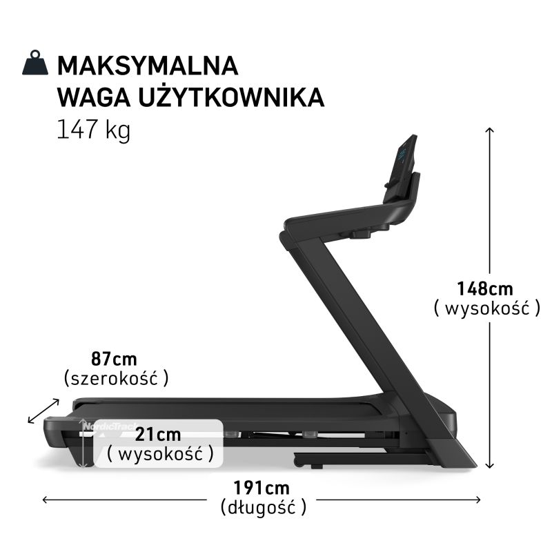 Treadmill dimensions : 191 x 87 x 148 cm (L x W x H)