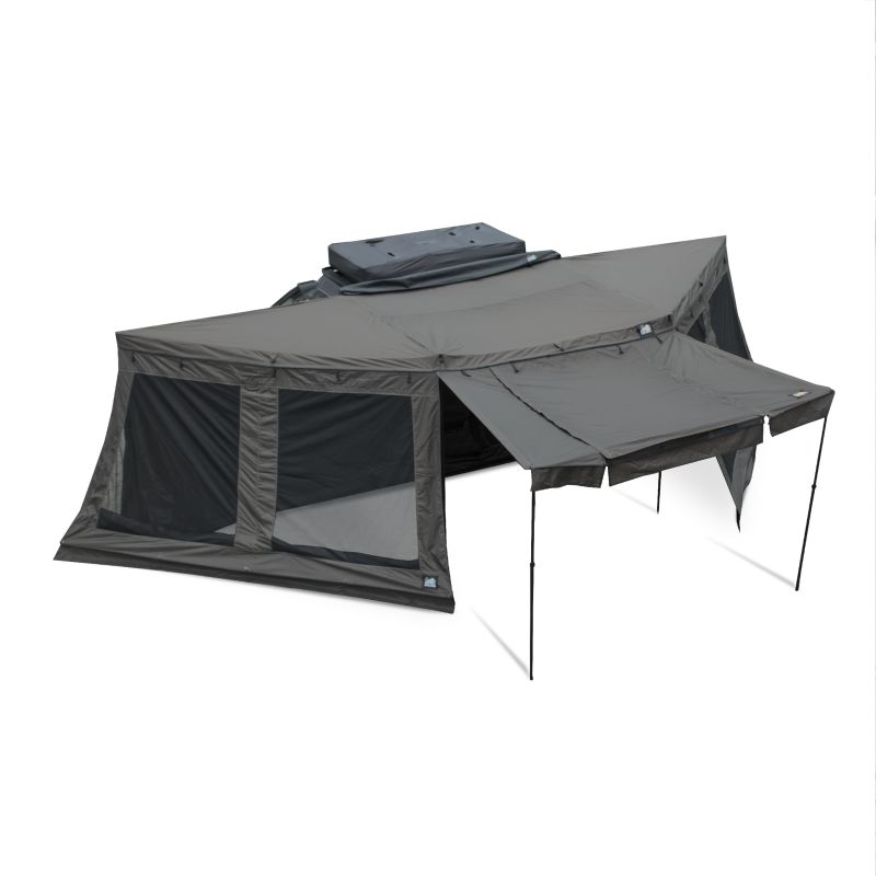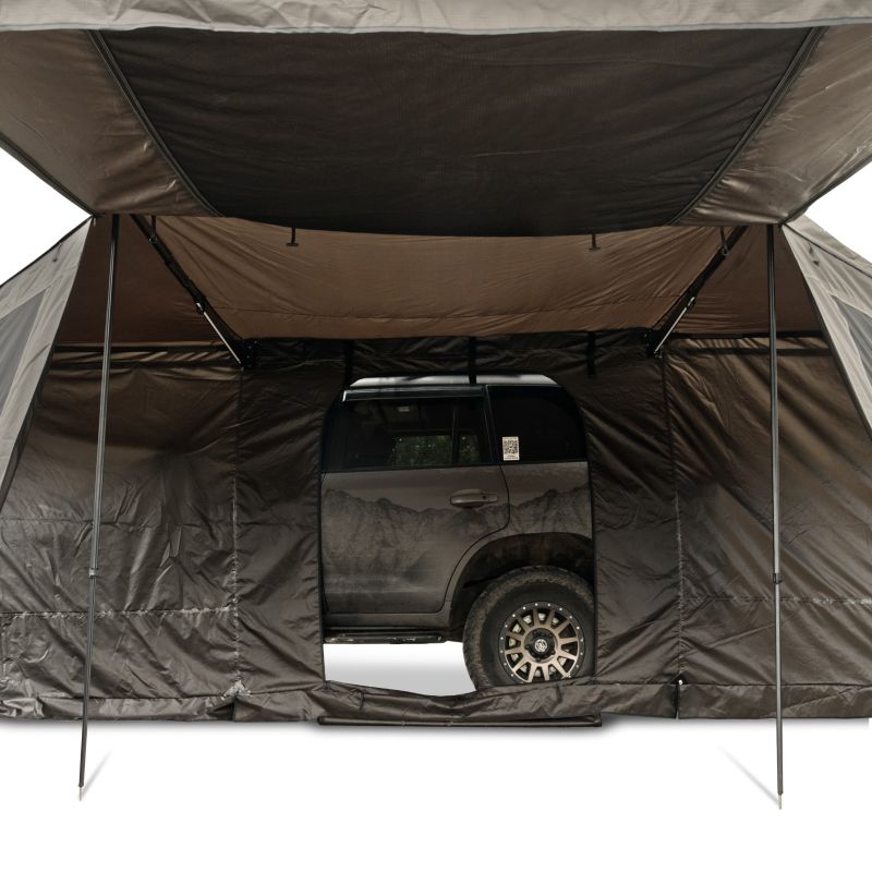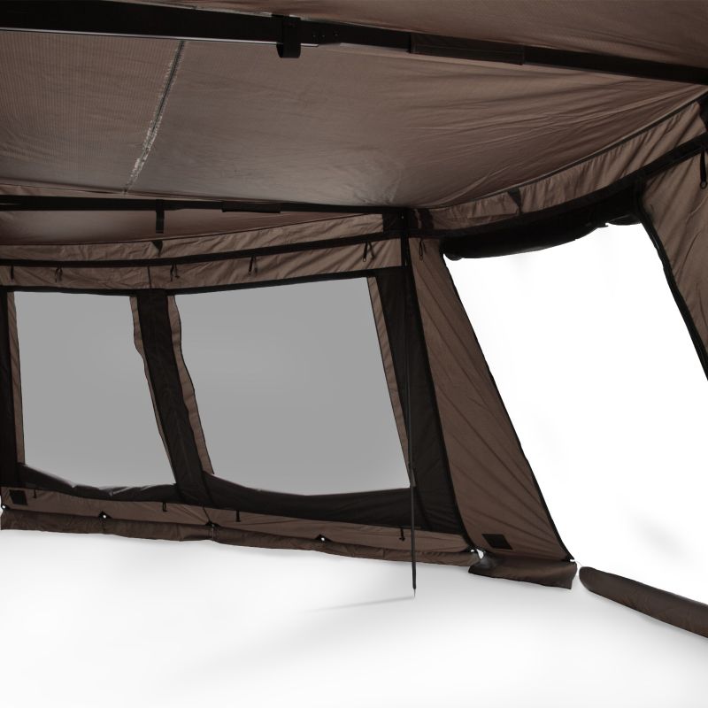 The SPEEDY M freestanding car awning is a great way to utilize the space around your vehicle. The canopy extends 180° around your vehicle, creating a large, shaded area where you can relax on hot days. Thanks to the awning's fully foldable legs, you can fully utilize the entire space. You can easily fit chairs, a camping table, or a thermal cooler inside. On a rainy morning, the durable, waterproof fabric (PU 2000 mm) will provide a dry surface where you can prepare breakfast or spend time relaxing and enjoying the fresh air.