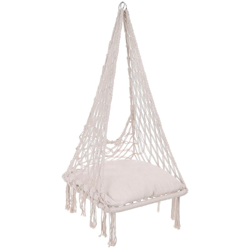 The Openwork Hammock Hanging Chair 60x60x150cm with ECRU Cushion from Saska Garden is a stylish and comfortable place to relax, perfect for both indoors and outdoors. Its solid construction, soft cushion, and elegant design ensure comfort, durability, and versatility.