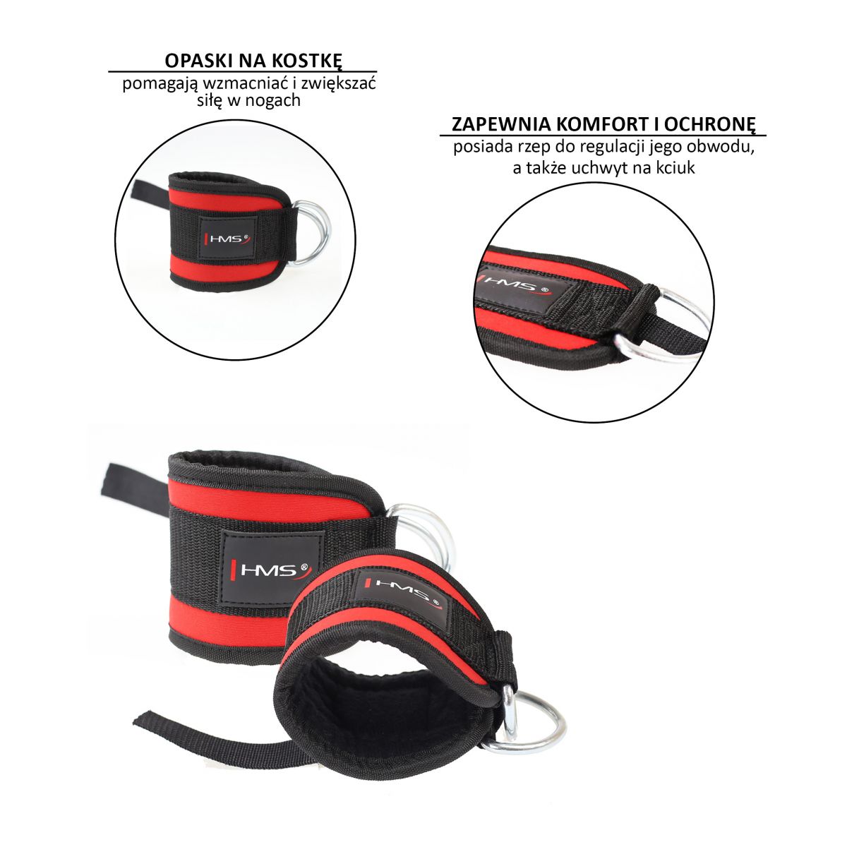 HMS resistance bands help strengthen and increase strength in the legs, thighs, glutes, and hips. Neoprene padding ensures safety and comfort in the ankle joint, while the comfortable and durable material enhances training comfort. A strong, double steel ring allows for training on any type of cable pulley.