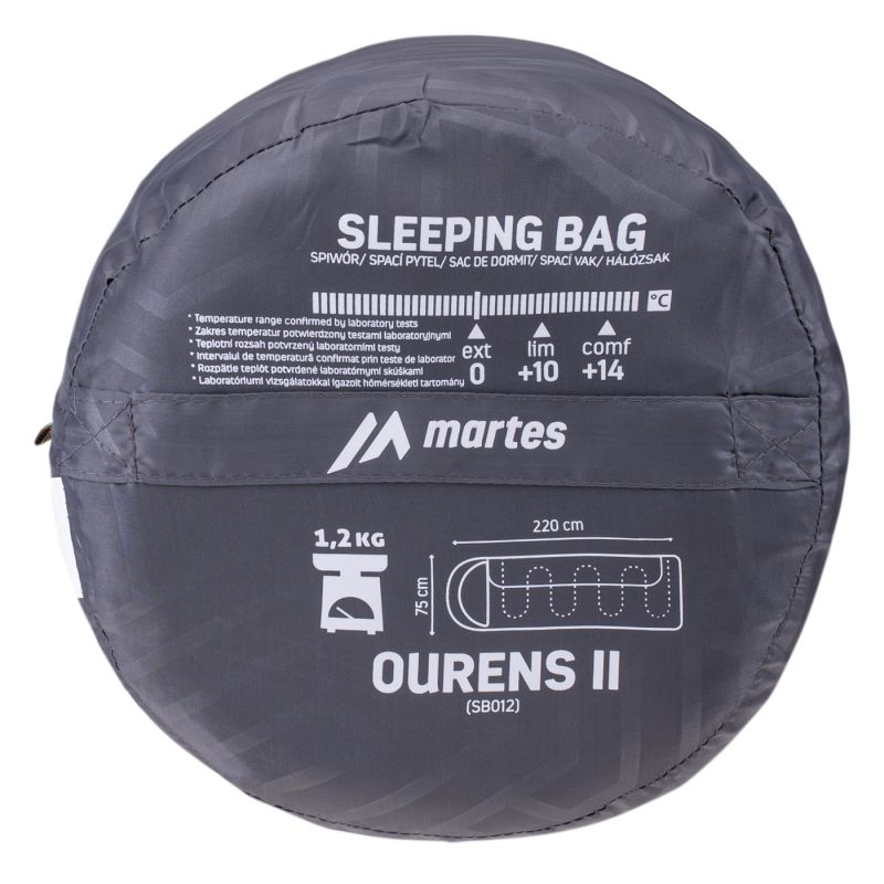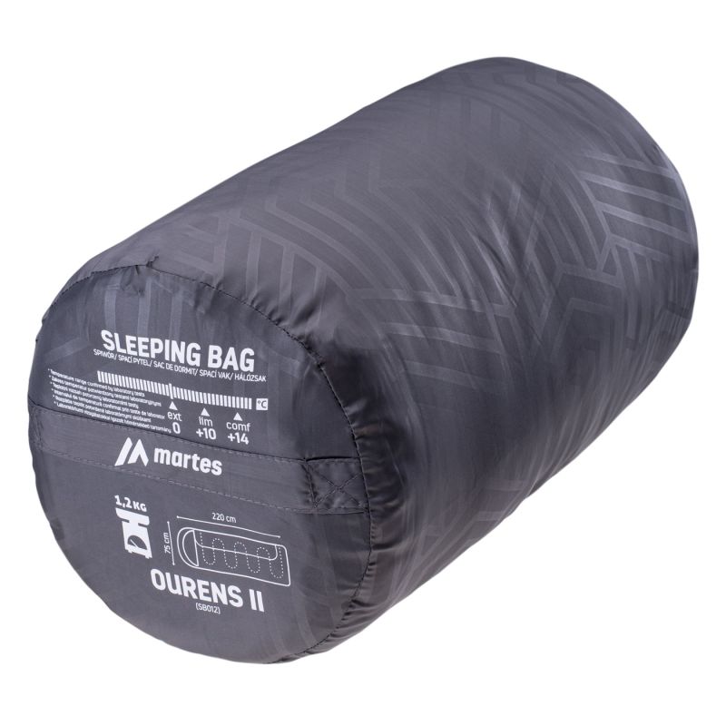 SLEEPING BAG SIZE: 220 x 75 cm PACKED: 38 x 20 cm WEIGHT: 1.2 kg TEMPERATURE RANGE: COMFORT: + 14°C LIMIT: + 10°C MINIMUM: 0°C MATERIAL COMPOSITION: OUTER MATERIAL: 100% POLYESTER LINING: 100% POLYESTER FILLING: 100% POLYESTER, 250 g/m2