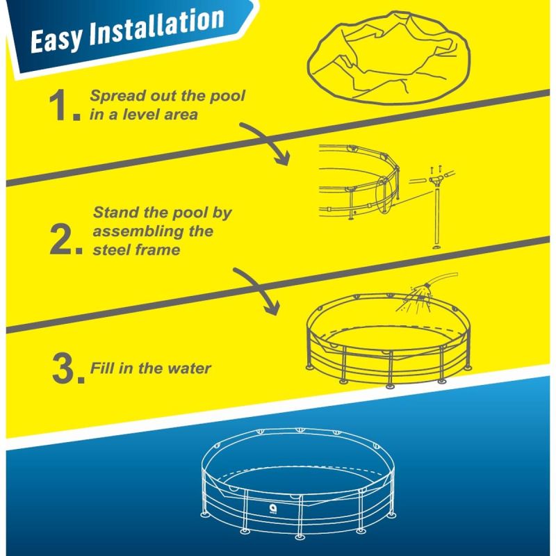 The pool is incredibly simple to assemble and requires no specialized tools. The steel frame and posts quickly assemble into a stable structure that ensures safety and ease of use. Ready to fill with water in no time!