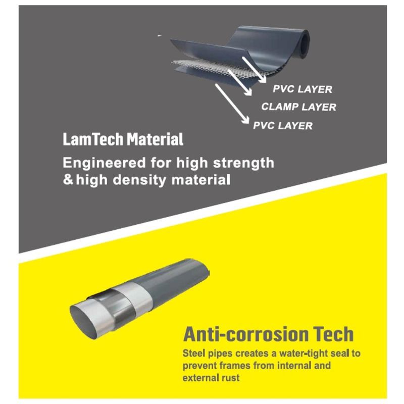 The pool features a reinforced frame with ANTI-CORROSION technology, providing excellent protection against rust and moisture damage. This ensures the pool maintains its durability and aesthetic appeal even after many seasons of use.