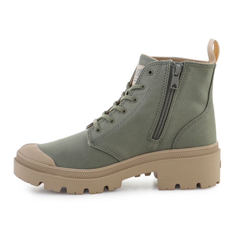 The Palladium Pallabase Twill 96907-333 in Vetiver is a modern women's ankle boot inspired by military and outdoor styles, designed for everyday urban wear. Its slim silhouette and lightweight construction ensure all-day comfort.