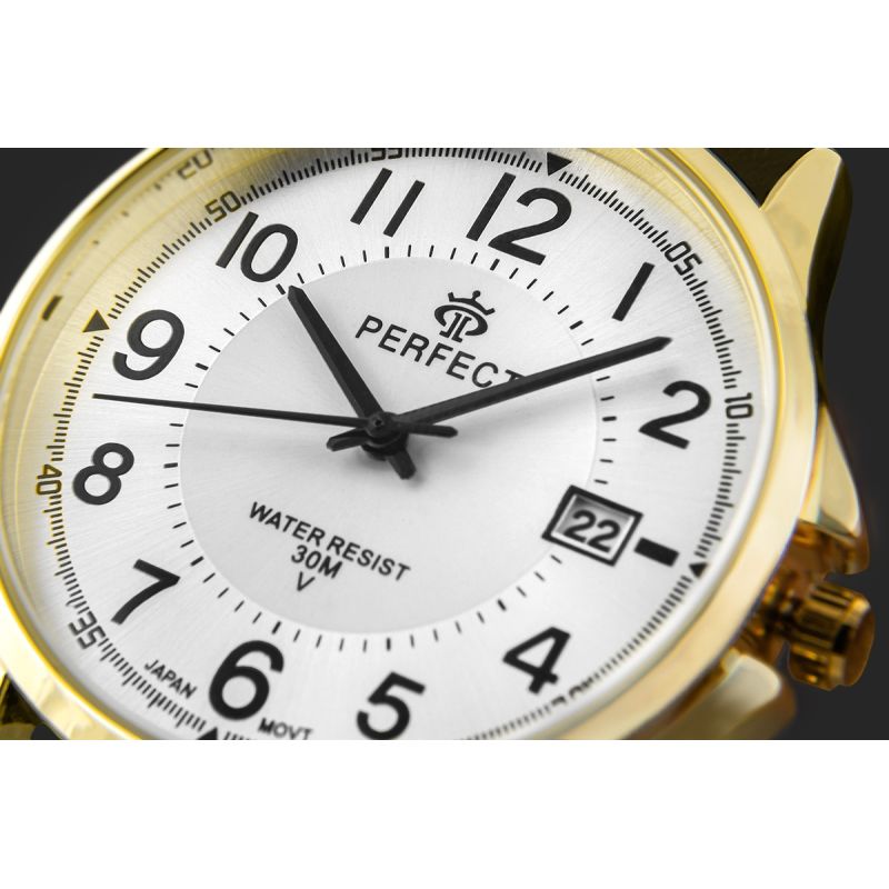 The men's PERFECT C710T model is a great choice for the man who values style and timeless elegance. The dial of this watch features an elegant gold-beige color with a satin finish that subtly reflects light, giving the watch a unique character. Combined with clear black indices and hands, it ensures excellent readability. Thanks to the date function, you always have not only the time but also the current day at your fingertips – a practical solution for everyday wear. The watch is equipped with a reliable JAPAN MOVT quartz movement, known for its high precision. The result is a watch that is perfect for both work and everyday wear – for the man who values style and practicality.