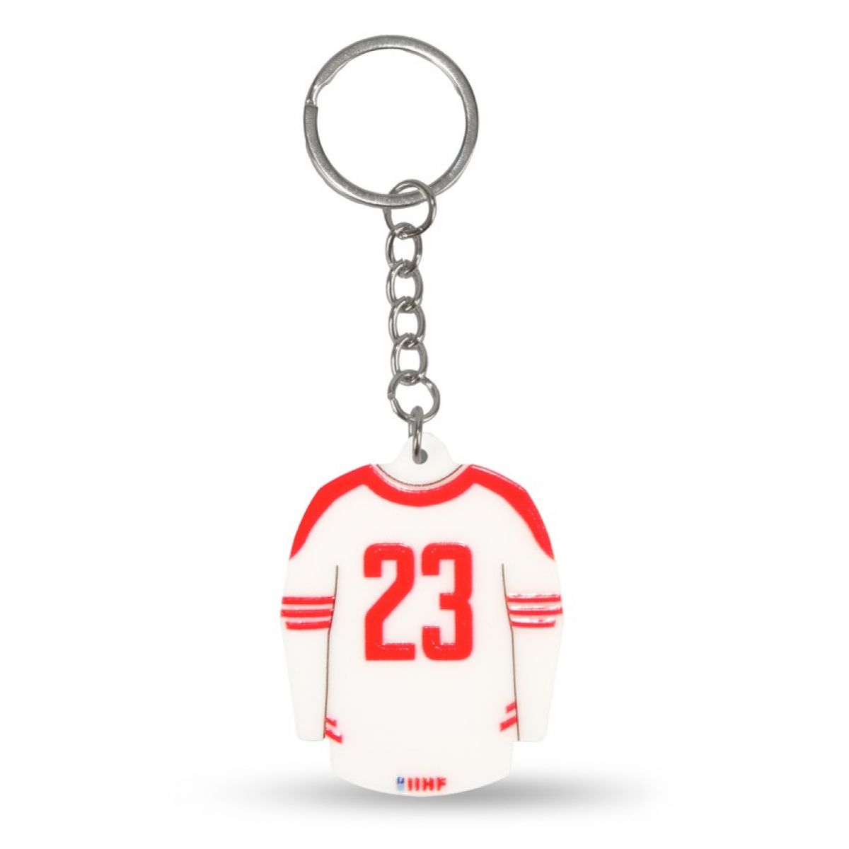 Poland Hockey Jersey (Away) Keychain. Show your support for the Polish National Ice Hockey Team with this unique keychain in the shape of a game jersey. Perfect for fans and sports enthusiasts, this keychain makes a great addition to your keys, backpack, or bag. Key Features: Design: A version of the official Polish National Hockey Team jersey in white and red. The Polish coat of arms and "Polska" lettering are featured on the front, adding a patriotic touch. Red details on the sleeves and shoulders enhance the sporty style. Number "23" on the back: The red number "23" and the International Ice Hockey Federation (IIHF) logo are visible on the back, adding authenticity and making the keychain look like a real hockey jersey. Advantages: Durable and lightweight. Practical accessory for fans. A perfect souvenir from a match or sporting event. This keychain is a great way to show your support for the Polish hockey team and a perfect gift for any fan.