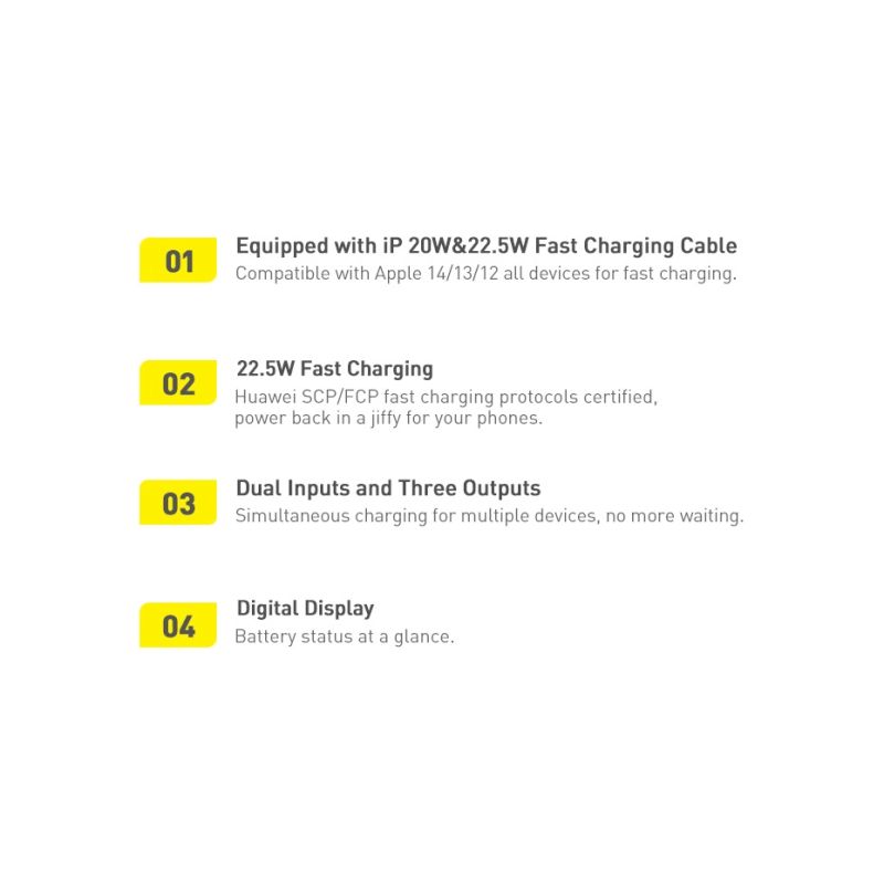 Powerbank, thanks to the technology used, supports the possibility of fast charging of devices. This means that in just a few minutes you are able to charge your phone or other equipment. A great facilitation is also the installation of a digital display in the front part. With its help, you can conveniently and quickly check the power bank's charge level and, if necessary, recharge it before leaving the house.