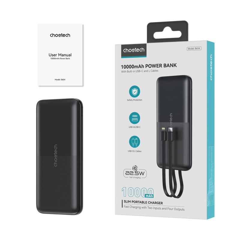 Powerbank Choetech B654 10000mAh 22.5W USB-A / USB-C / micro USB with built-in USB-C / Lightning cable - black