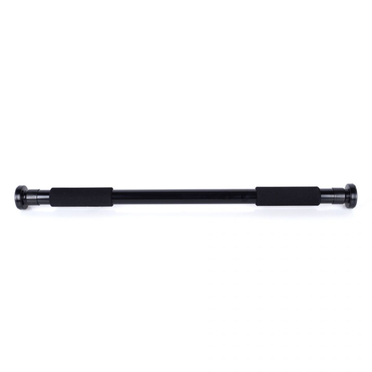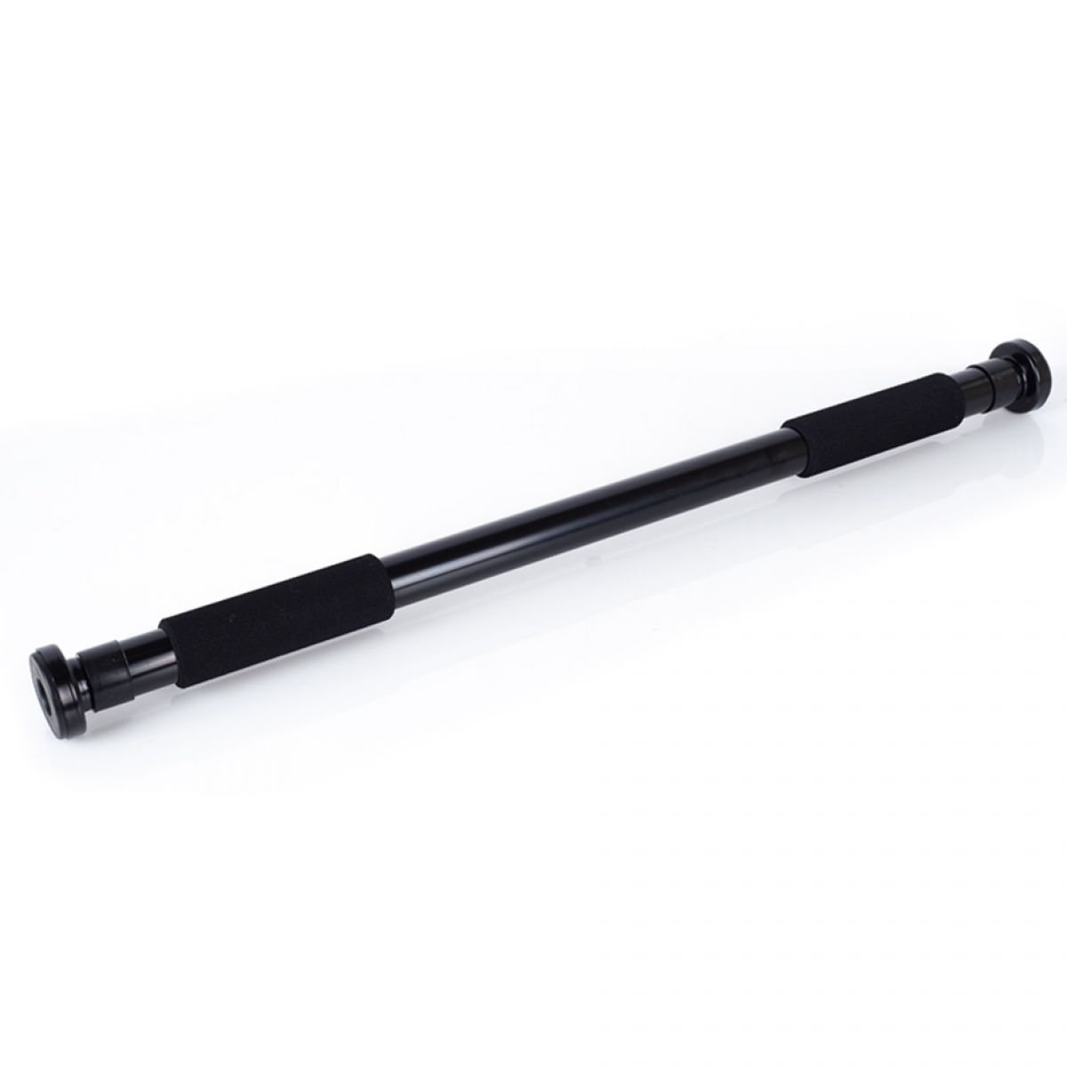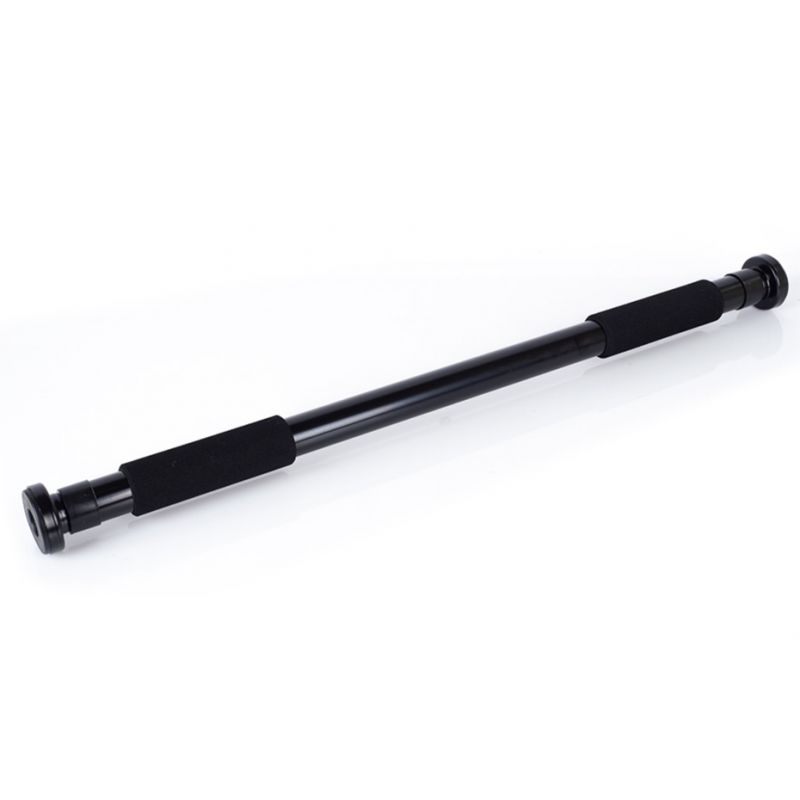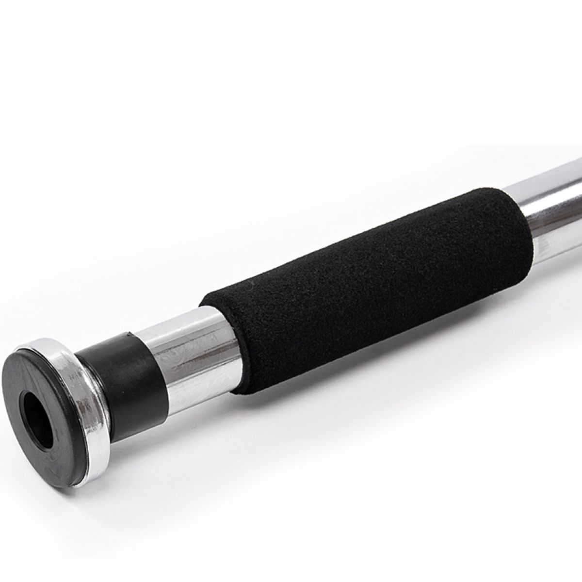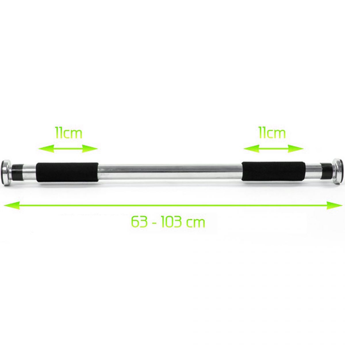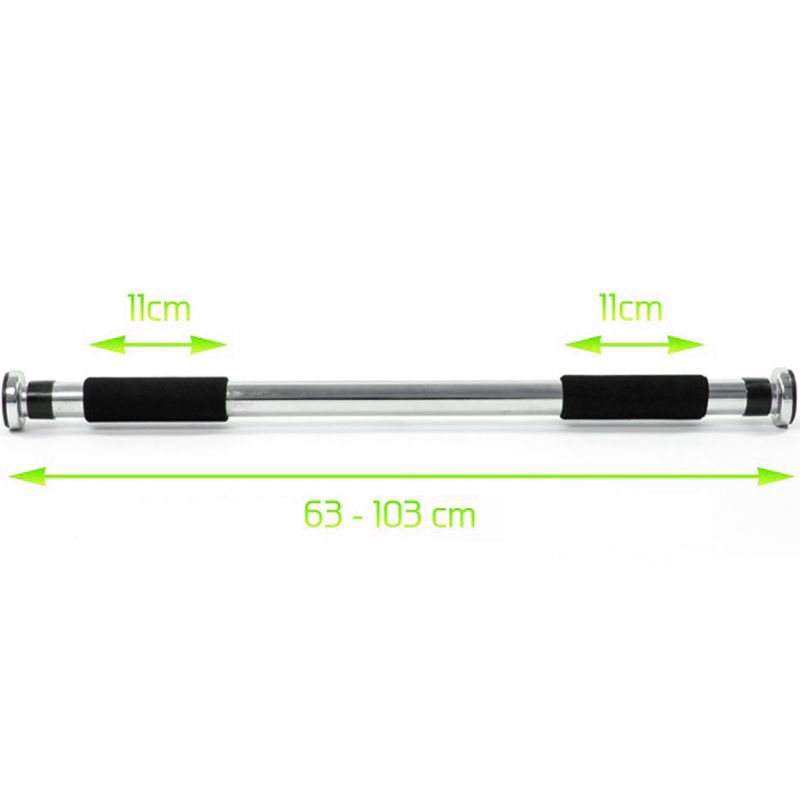 This high-quality steel pull-up bar is perfect for exercising at home. Quick and easy door installation makes it very practical. It's a simple and easy way to exercise your back, abs, thighs, biceps, and triceps. Its attractive chrome finish makes it look great in any room. This pull-up bar allows you to quickly transform a regular doorframe into a workout station. Rubberized ends ensure the device won't slip off the doorframe. TECHNICAL DATA: Exerciser for arms, abs, and back muscles. Adjustable length from 63cm to 103cm. Maximum load: 100kg.
