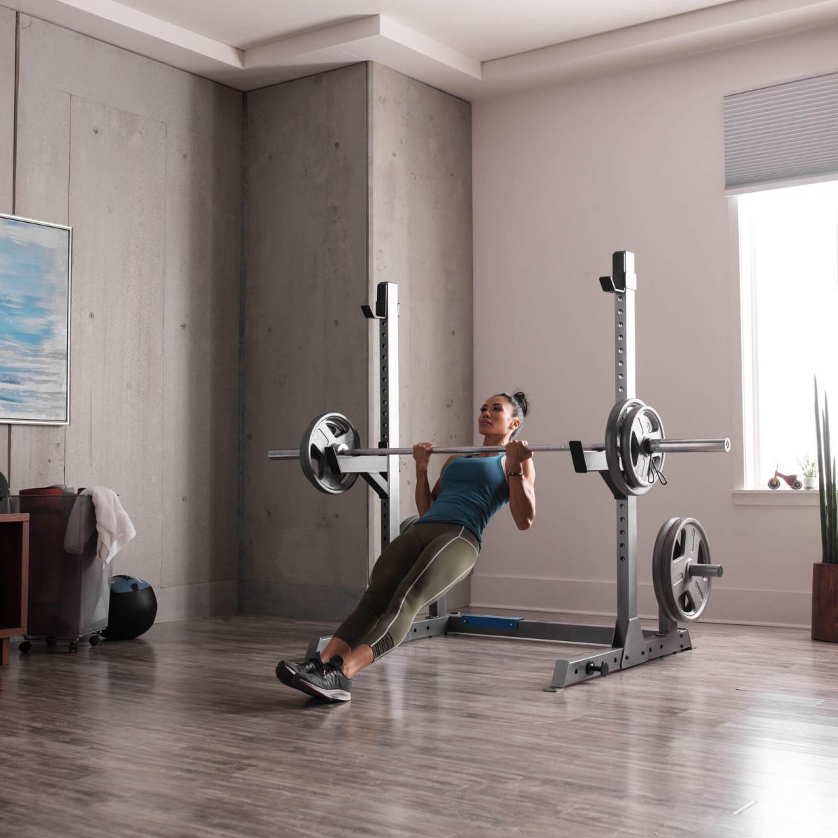 - You can set the barbell holders at a comfortable height, depending on your height and the exercises you want to perform. This is made possible by the freely adjustable safety hooks. Adjustments allow you to adjust the barbell's height and distance from the bench, making it even more versatile. Additionally, the rack is equipped with two weight holders, allowing you to keep your home gym organized. The rack also includes holders for resistance bands.