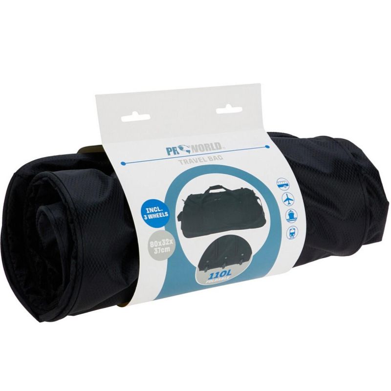 110L BLACK TRAVEL BAG, POLYESTER RIBSTOP, BLACK ZIPPER CLOSURE, ELASTIC DRAWSTRING WITH ROUND DRAWSTRING ON TOP, 2 MESH SIDE POCKETS ON 1 SIDE, 2 BLACK HANDLES WITH STEEL ON TOP AND 1 ON SIDE WITH MATCHING FABRIC LINING WITH VELCRO, 1 ADJUSTABLE BLACK SHOULDER STRAP, INTERIOR COATING, BLACK ROPE/STEEL DETAILS ON SIDE, 3 RINGS, PROWORLD LOGO ON SIDE, EACH WITH PAPER SLEEVE/ 395X185X120MM,