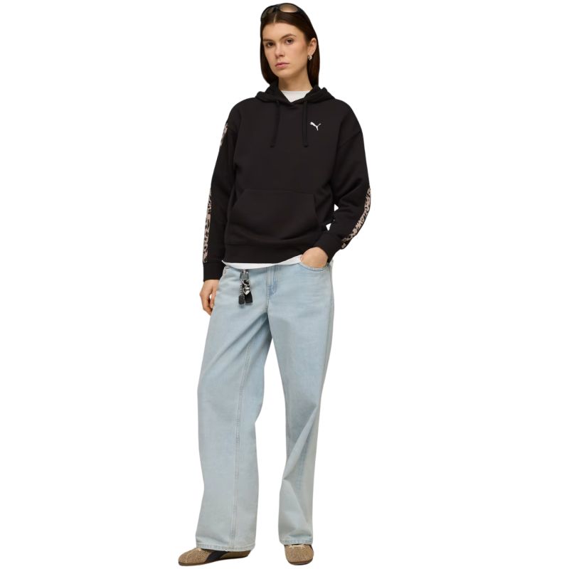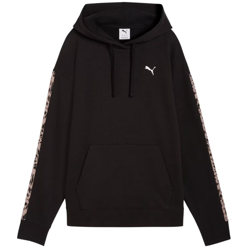 Puma ESS Graphic Animal Comfort Hoodie Women's Black 691822 01 This Puma women's sweatshirt is perfect for everyday wear. Small logo on the front. Loose fit. Ribbed cuffs and hem. Front pocket. Adjustable hood. Animal print stripes. Specifications: Main material: 68% cotton, 32% polyester Ribbing: 97% cotton, 3% elastane Hood lining: 100% cotton