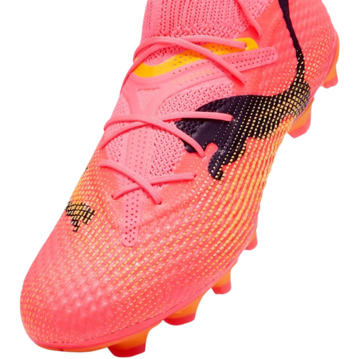 Puma Future 7 Pro+ FG/AG 107705 03 Men's Puma Football Boots showcase your unique style. These semi-professional boots with an advanced outsole are a practical solution for club matches played on natural grass and artificial surfaces. The updated design aligns with the Forever Faster collection. The upper is made from at least 20% recycled material. Technical data: Fuzionfit+ – the upper combines a lightweight, protective mesh, additional stretch knit, PWRPRINT and two layers of PWRTAPE tape, which translates into a natural fit and unlimited freedom of movement PWRTAPE – upper reinforcement offering support and durability PWRPRINT – technical texture placed in key contact zones to increase ball grip and control over dribbling and passing Dynamic Motion System – the sole with an advanced stud arrangement has been designed for support, grip and freedom of movement FG / AG – a special stud configuration designed for playing on natural surfaces and artificial grass (4G)