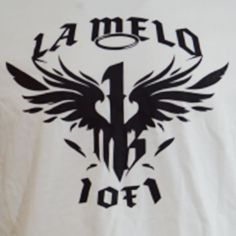 The blouse has a comfortable round neckline and is decorated with a "La melo" motif on the chest in black.