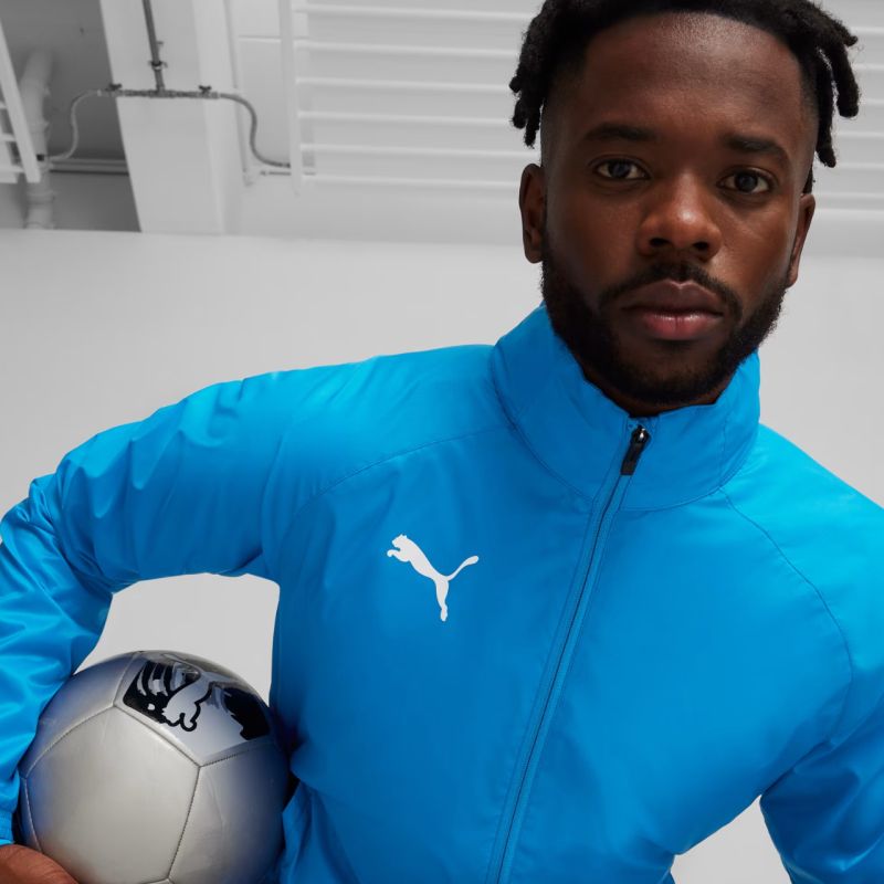 Puma Team Goal All Weather Men's Jacket, Blue 659038 02. The Puma TeamGOAL All Weather Jacket is an essential addition to any football kit. This durable jacket is perfect for training in rain and inclement weather. It features a regular fit and raglan sleeves for enhanced freedom of movement. It features a collar that houses a fold-out hood. Elastic cuffs and a drawstring hem. Two side pockets. The Puma logo is embroidered on the chest. Specifications: Material: 100% recycled nylon