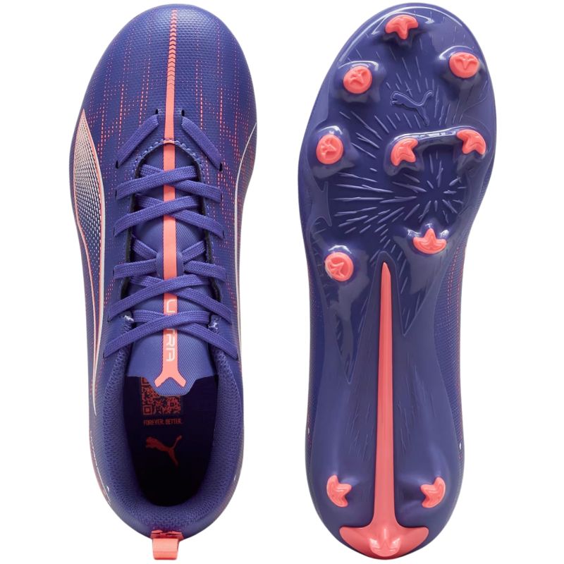 Puma Ultra kids' cleats will boost your energy and speed during football matches. These recreational boots are part of the premier Puma Formula Pack collection. They feature a lightweight synthetic upper with embossed details and a print. Classic lacing. The Speedsystem outsole combines high-performance fibers and an innovative stud system for maximum energy return and improved acceleration. FastTrax studs and more rounded lateral studs contribute to excellent traction on both natural and artificial grass.