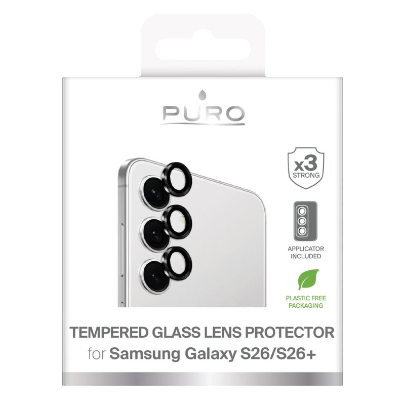 Choose 360° protection for your Samsung Galaxy S26 and S26 Plus. Puro tempered glass for the rear camera protects each lens individually, so you don't have to worry about scratches even when in contact with hard surfaces. The design is designed for maximum durability and full case compatibility. The black frame aesthetically highlights the camera module, and the included mounting mask facilitates precise application. It provides effective and discreet protection for the most sensitive elements of your smartphone.