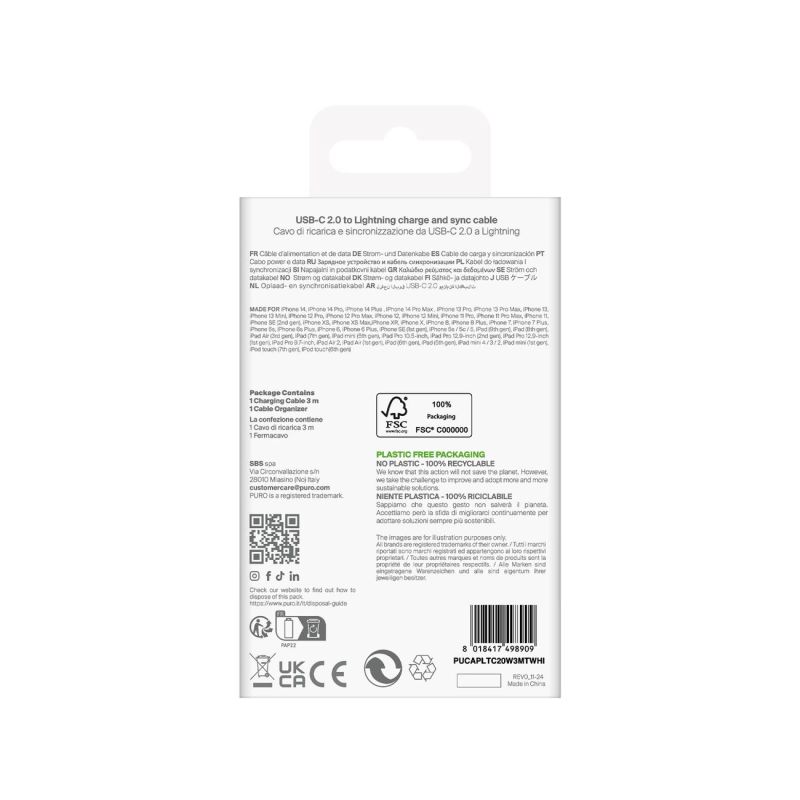 Need a longer cable to charge your iPhone or iPad? The Puro TPE 20W USB-C - Lightning cable with a length of up to 3 meters provides full freedom of movement and convenience at home, in the office or while traveling. Thanks to the support of Power Delivery technology, the cable allows for fast and safe charging of Apple devices, while remaining compatible with other mobile devices. The solid construction made of flexible TPE effectively protects against damage and wear, even with intensive use. Reinforced ends increase durability, and the smooth coating reduces cable tangling. This is an excellent choice for those who expect reliability and greater range without compromise.