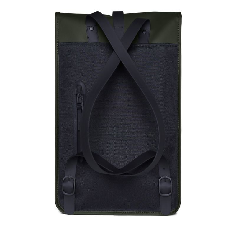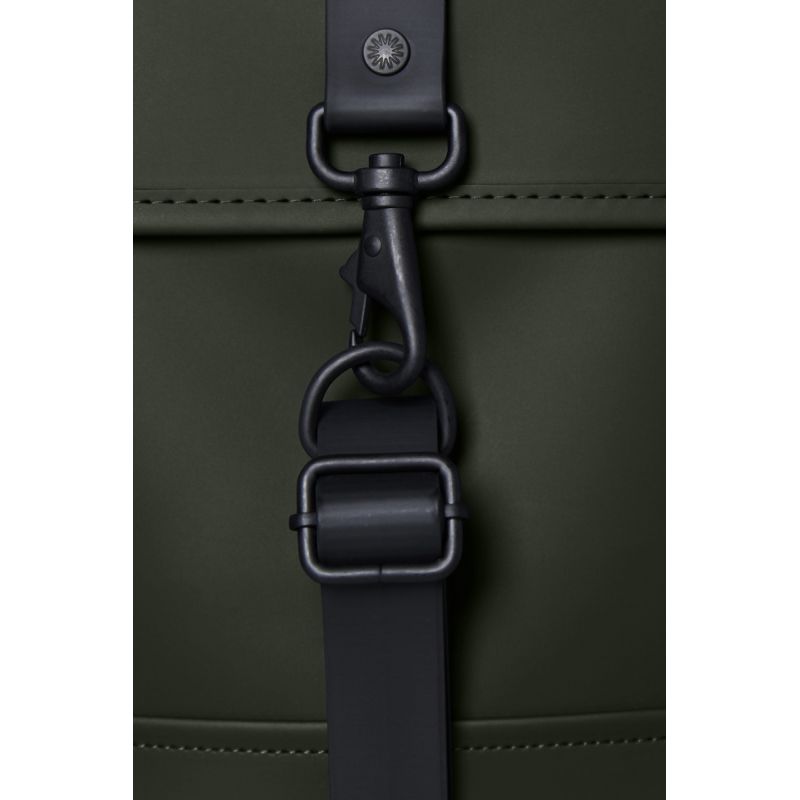- The backpack silhouette is a Rains classic, featuring a prominent flap and a central strap with a carabiner closure.