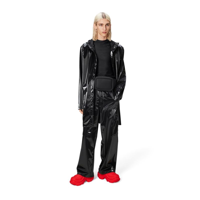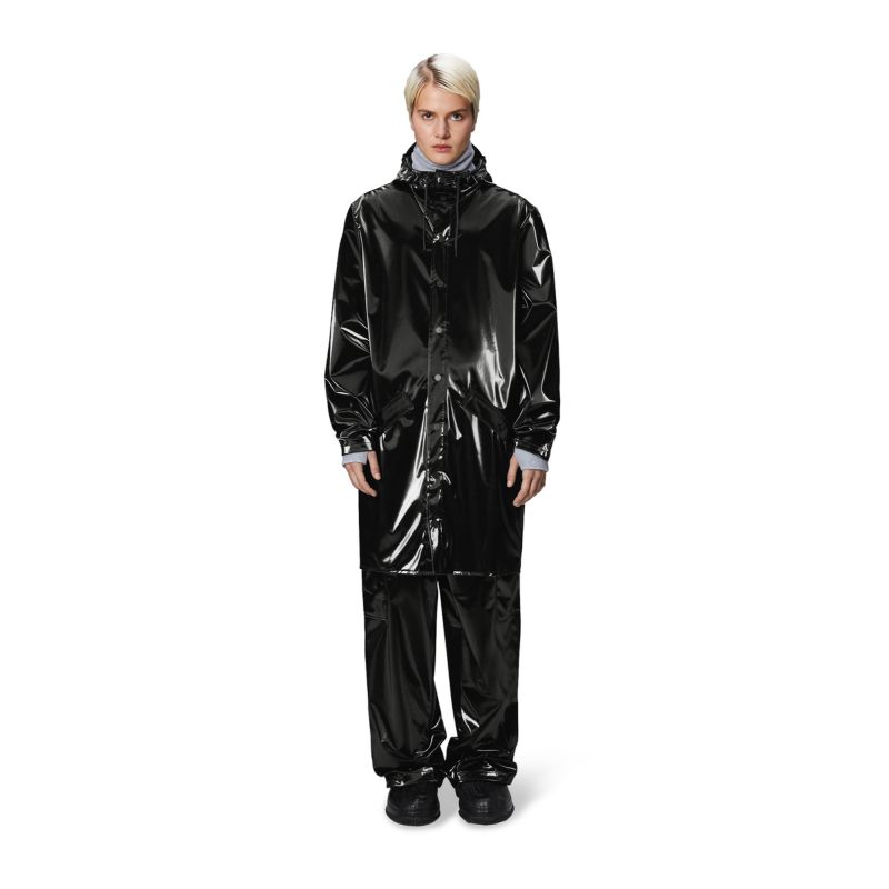 The Long Jacket is made of Rains' signature polyurethane material and features welded seams. The finish is lightweight and soft to the touch.