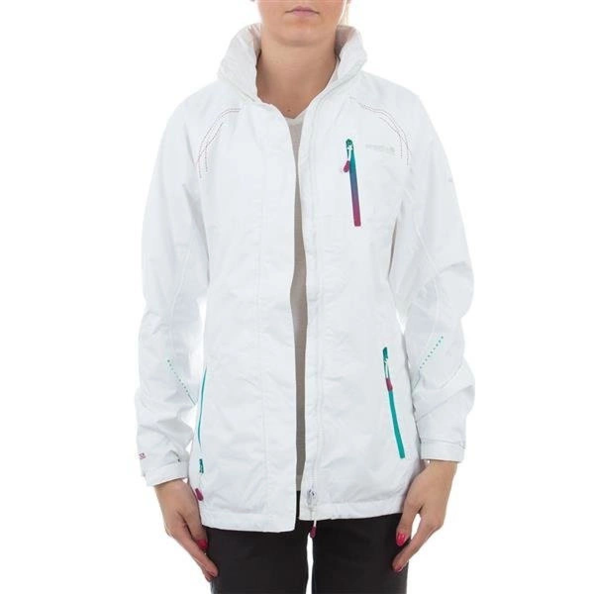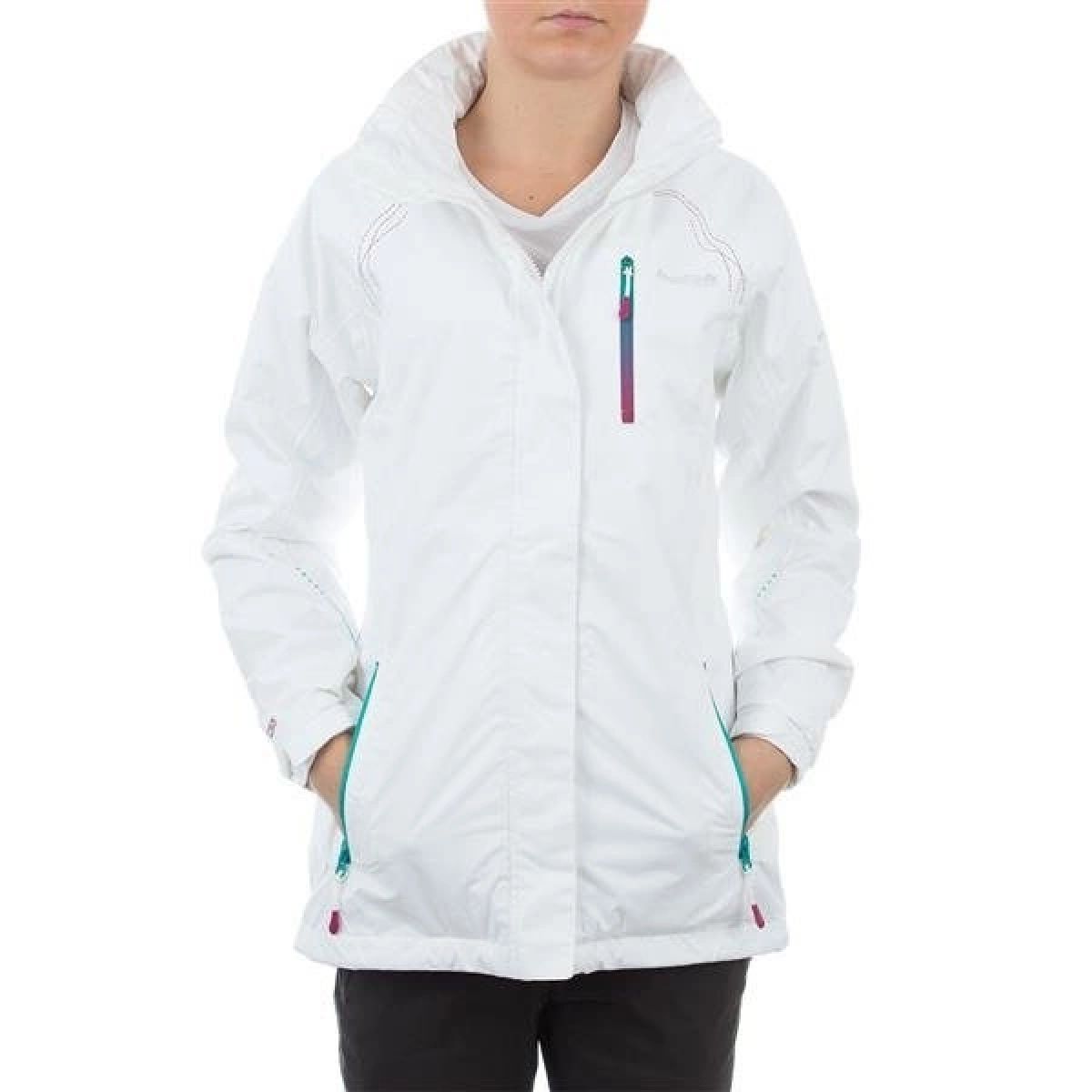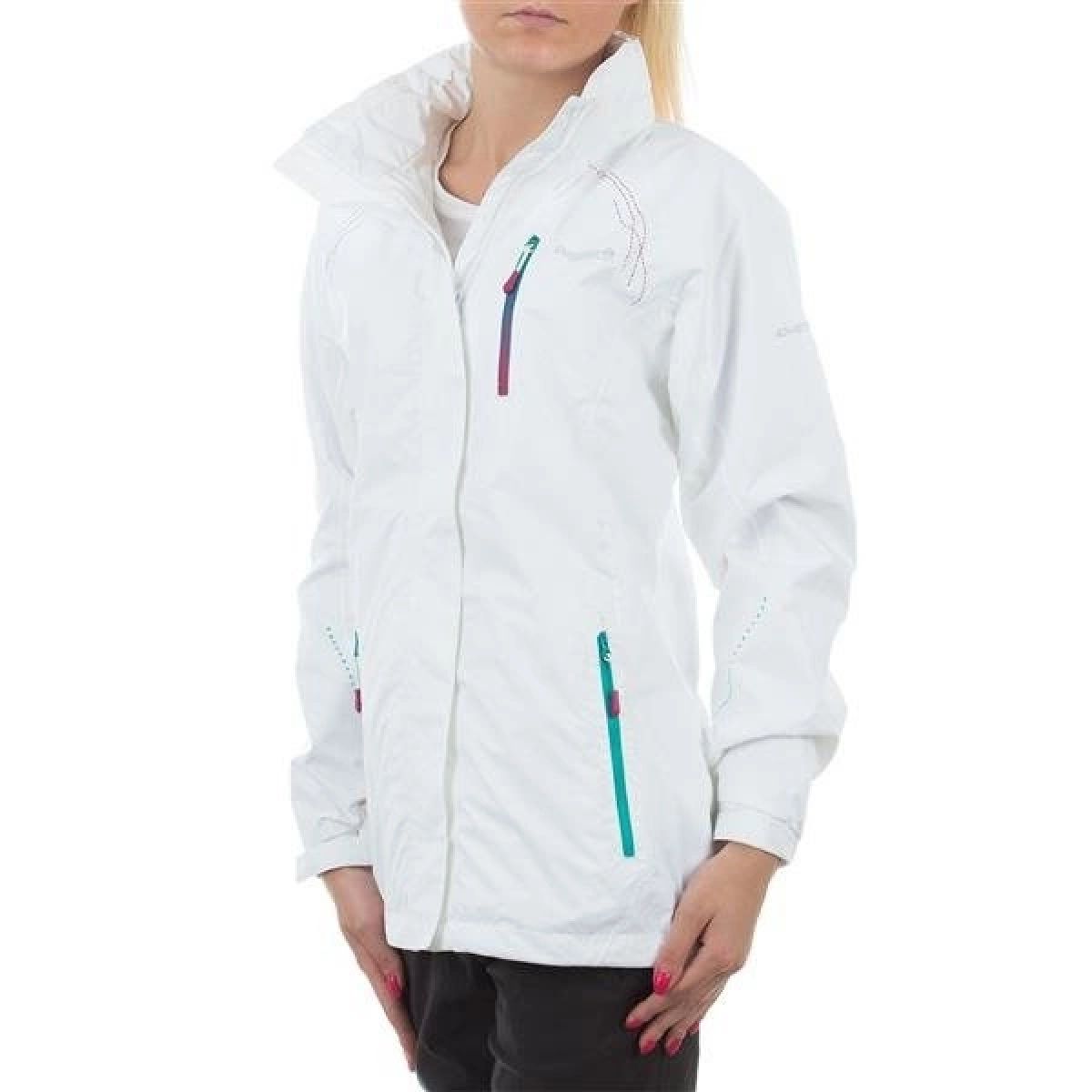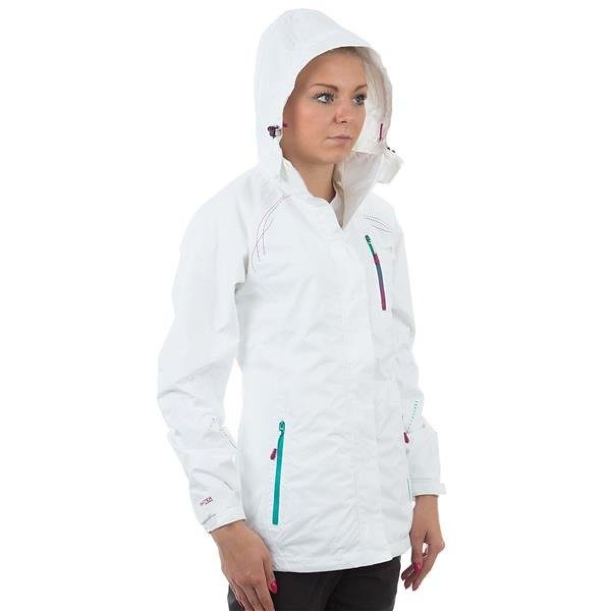Material: 100% Polyester Lining: 100% Polyester Women's outdoor jacket made of waterproof, windproof, and breathable Isotex 5000 fabric. This jacket is perfect for trekking or hiking in various conditions. - 5000mm waterproof rating - taped seams - mesh lining - stowable hood with adjustment - adjustable hem - adjustable cuffs - 3 front zip pockets - internal map pocket.