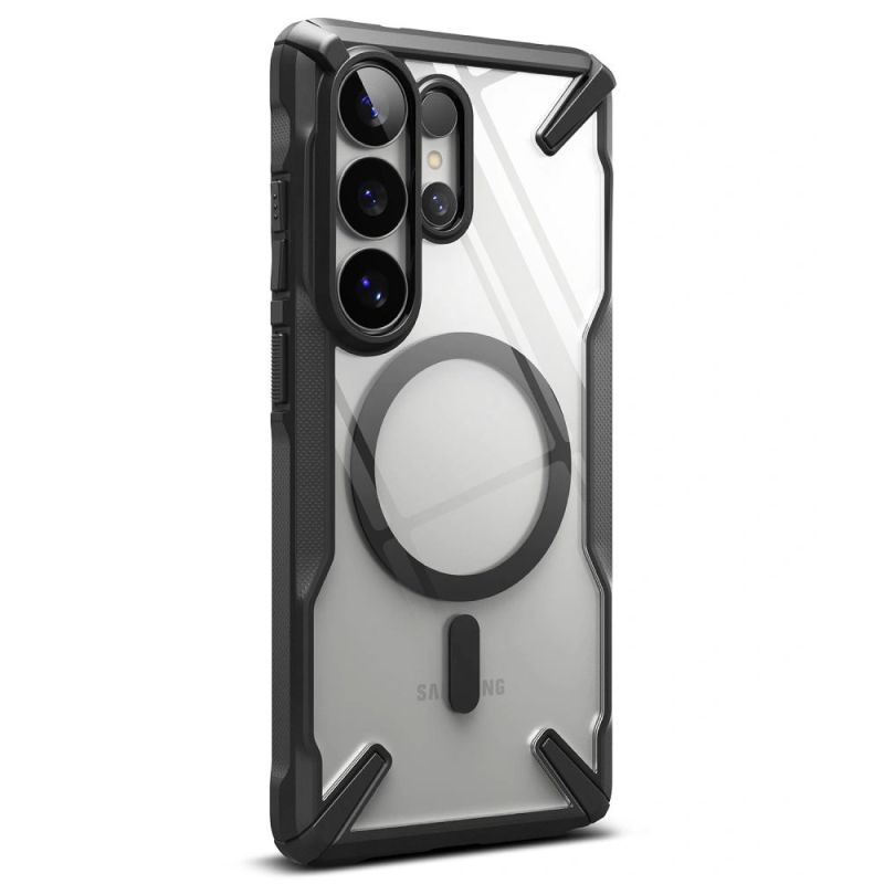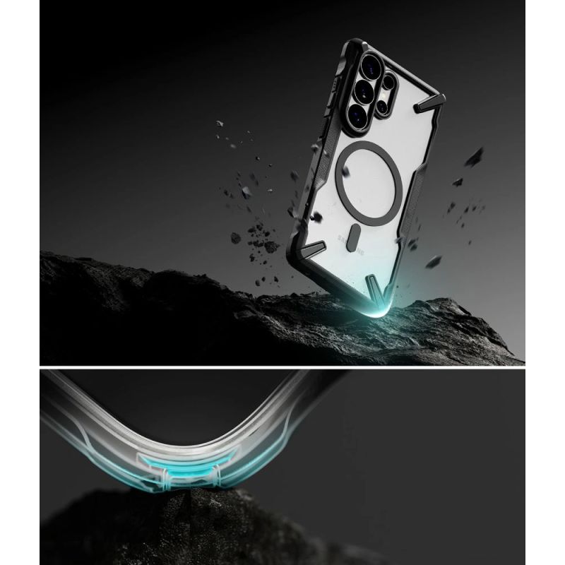 The Ringke Fusion X Magnetic MagSafe is a reinforced hybrid case that combines maximum protection with MagSafe functionality. Made of two layers – flexible thermopolyurethane (TPU) and hard polycarbonate (PC) – it provides effective protection against drops and damage. A built-in magnetic ring allows for stable attachment of MagSafe accessories and fast wireless charging. The black frame contrasts with the transparent back, creating a sporty look and highlighting the phone's unique design.
