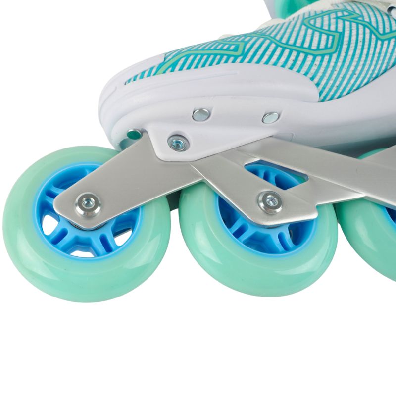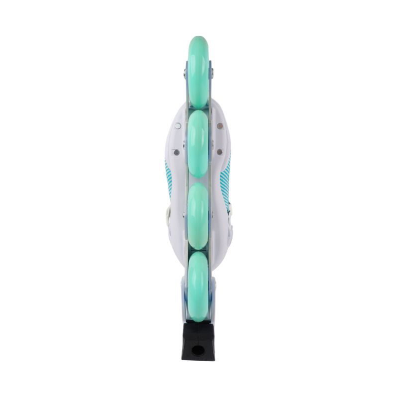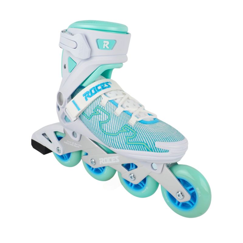 Roces R-Evo 84 White and Mint Inline Skates 400905 0002 Roces women's inline skates are designed for comfort, stability, and precision skating. The softboot construction conforms to the shape of the foot. A durable shell is made of fiberglass-reinforced polyamide. A three-way closure system includes a Heel Lock buckle, a lacing system, and a Velcro strap. Putting the skates on is quick and intuitive thanks to the Easy Entry system. Webbing Fit technology evenly hugs the instep. Cool Breathe technology ensures effective ventilation. The aluminum frame ensures durability. Wheels with ABEC-7 bearings ensure a smooth ride, good performance, and complete control. The anatomical insole completes the look. Technical data: Easy Entry System: a special recess in the skate collar makes it easier to put the skate on and off Cool Breathe: mesh ensures proper ventilation Hell Lock: a buckle that stiffens the skate, protects the ankle joint Shell: high-quality polyamide reinforced with glass fiber Bearings: ABEC-7 Frame: cast aluminum Wheels: PU (commonly called rubber), 84 mm / 82A Spacer sleeves: aluminum Rocker washers: aluminum Axles: Hot Rod F Brake included The model does not include a skate frame Maximum user weight: 100 kg